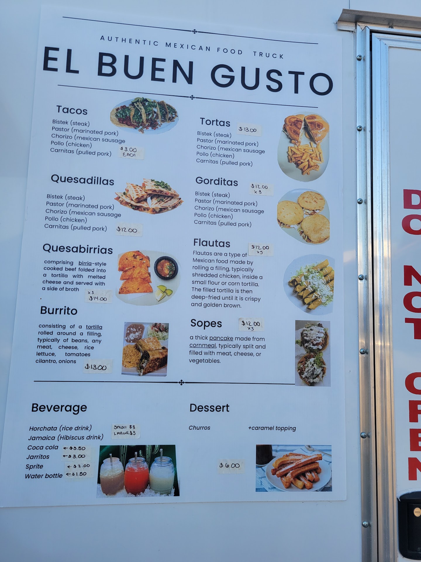 Read more100% recommend! My wife & I came here after a different nearby food truck rudely turned us away 30Min before their listed closing time. Hurried over to El Buen Gusto to see if we could still order 10min before close and were blown away! Super friendly staff. They came over to wipe down the table while we waited for food and asked if we would like to eat there despite closing in a few minutes. We ordered it to go but the exceptional service was so appreciated! We got our food in ~5min and it was so good! Immediately at the top of our list...