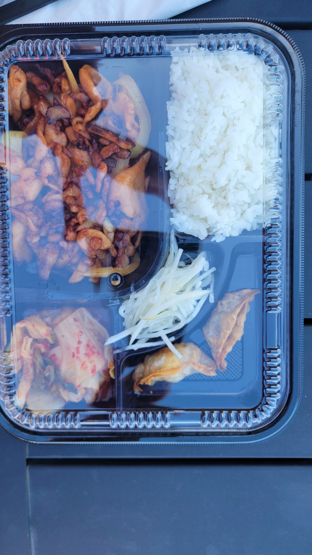 This is an awesome Korean barbecue restaurant that does small âBento boxâ-like meals for Korean food. They have limited options, and each option comes with rice, kimchi, pickled radish, and two fried Gyoza.