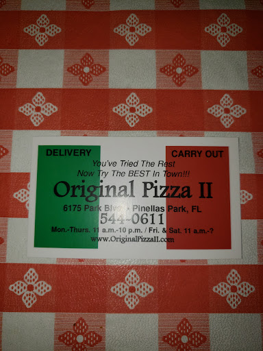 MENU: 5 stars. Original Pizza's menu is pretty straightforward: they offer pizza. It's not that hard to make good pizza, but man is it easy to make crappy pizza. Fortunately, Original makes its pizza pretty darn good. It took about 15 minutes to prepare (I called ahead). They had some other things like subs, hoagies, calzones, and the like. If I'm in the area again I'll these other things.