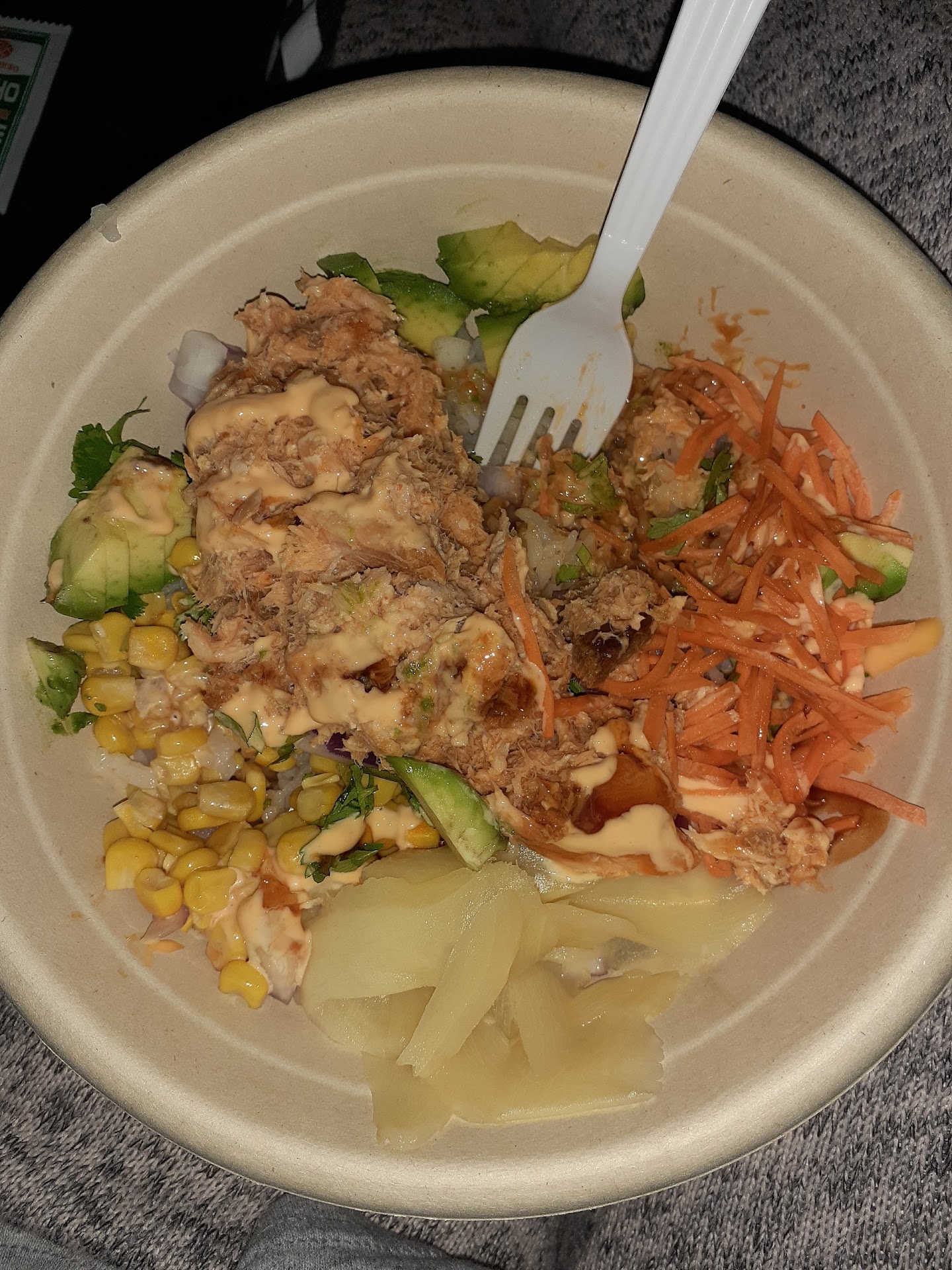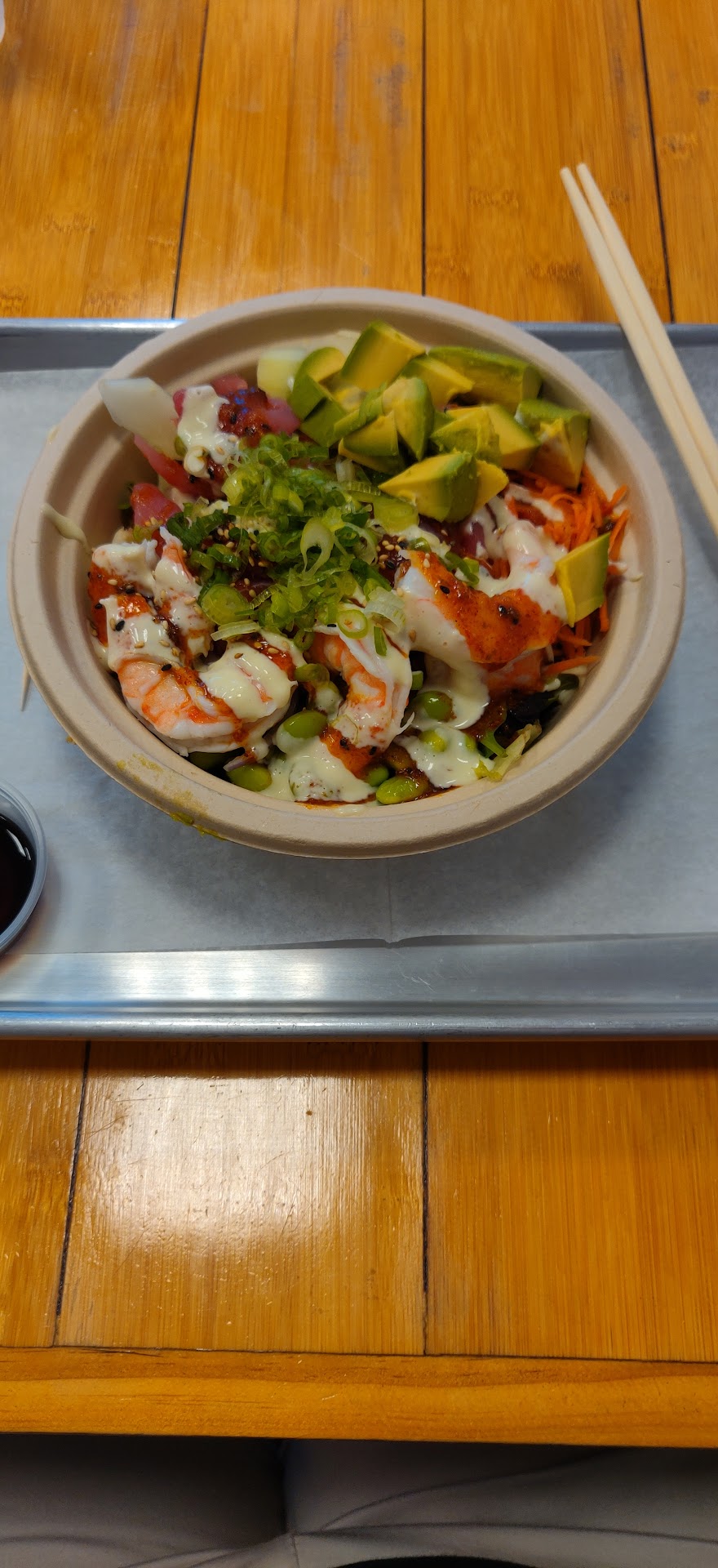 Read moreFirst time here for lunch. The one guy did a good job at walking me through the menu. I ended up getting the salad bowl with "two scoops" (shrimp and tuna). They allow as much veggies as you'd like. Great selection. I had edamame, cucumber, carrot, red onion, scallions, and seeds. They have several sauces. I topped mine with the original sauce and the wasabi sauce combo. Both packed a little heat but that's what I was looking for. It hit the spot. Everything was super delicious and fresh actually. My only one star down was the neutral greeting when I came in saying "hello!" and wasnt really met back with one by the two people. I may be too enthusiastic for some. But also, for the dollar upcharge on the avocado that I added, it didnt look as plentiful as I saw in other peoples photos from here on Google. Maybe they ordered double. Who knows. But Im a huge lover of avos so I was a little bummed. Still though, I'd come back again to try out other combinations. FYI - They can also do rice bowls and...