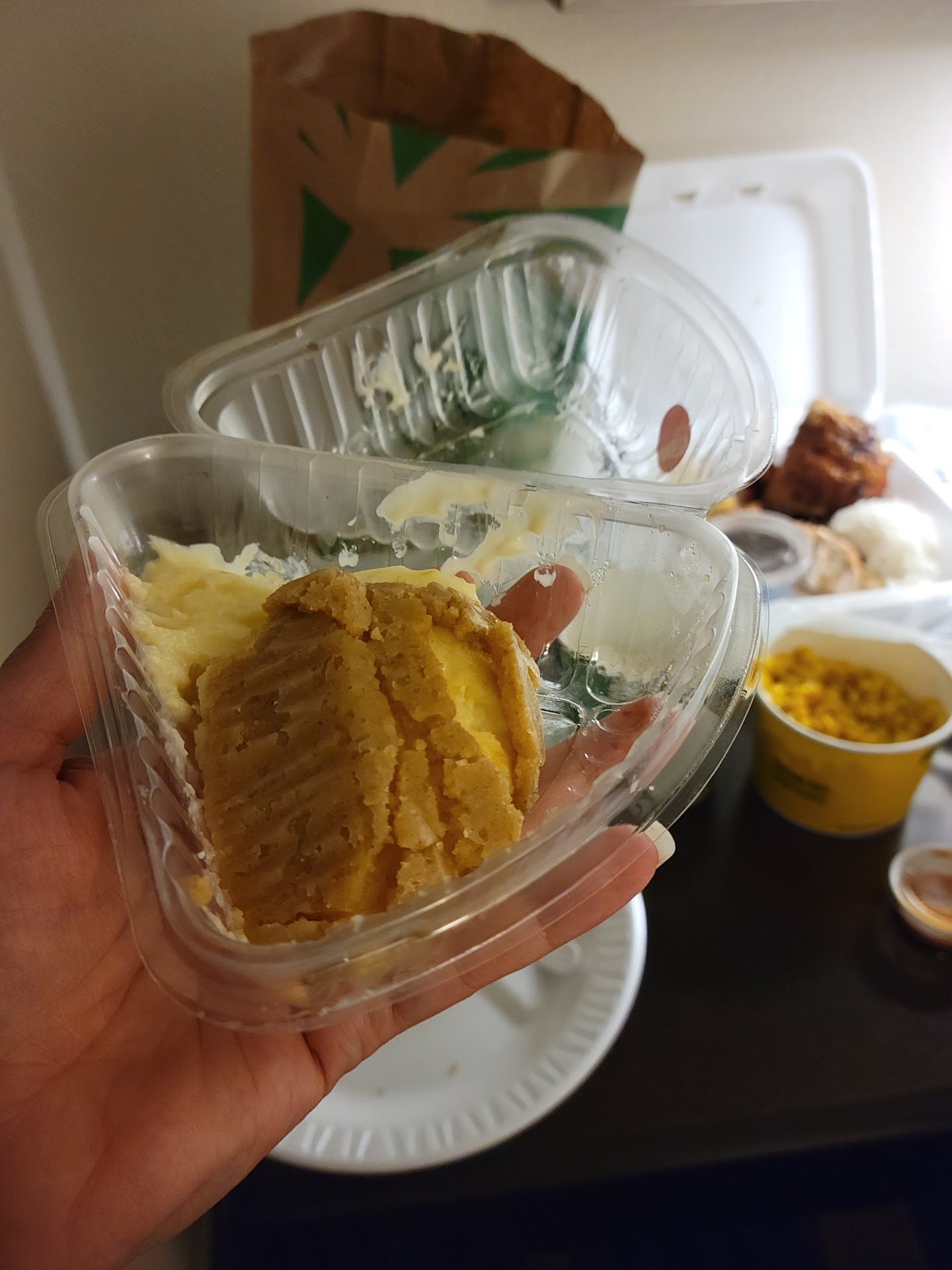 Items we were trying to order were not available (topped tostones and mac and cheese). We had 4 dinners and asked for 15 curry mustard sauce (the small containers you get with your meal). Your website states you can have up to 7 per dinner. We asked for way less than 7 each for the 4 dinners. The person taking the order asked if it was OK to put the sauce in a larger container. We said OK since there were no small containers that were pre-made of curry mustard. The person putting together the condiments said, "They want 15" in a disbelieving tone. She then put the sauce in one of the containers that is used for the beans, which is a 5 1/2 ounce container. Since we ordered food for 2 houses we asked for a 2nd container. The girl flounced away and came back and said we would be charged, or she could make up 15 small containers at no charge. I was shocked as we were trying to make it easier on staff, but we did not want to pay for condiments that normally come with the dinner. We told her to make up 15 small containers, which she did and half filled. She dumped the curry mustard out of the larger container and got it in about 8 small ones, so she ended up making more work for herself. Then they told us the order was ready, but we always check before we leave and they forgot 3 things. We had them make the forgotten things and we were on our way. Sweet plantains were hard and inedible. Both the Yucca bites and the Nutella Empanada were so greasy they were inedible as well. Final straw we had raw chicken (see attached photo). We threw the food out and had to go somewhere else for dinner. Are you trying to make customers sick? Not happy that we basically spent $45 for food that was sub-par and had to be thrown away and then had to pay for dinner...