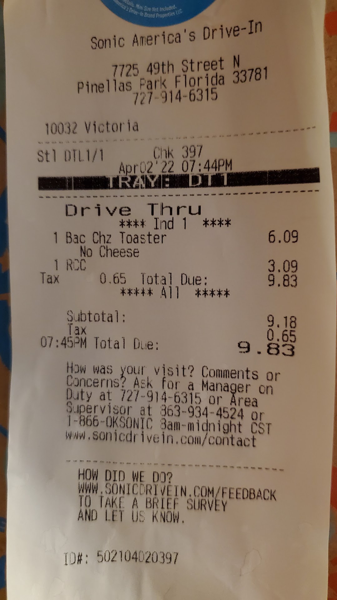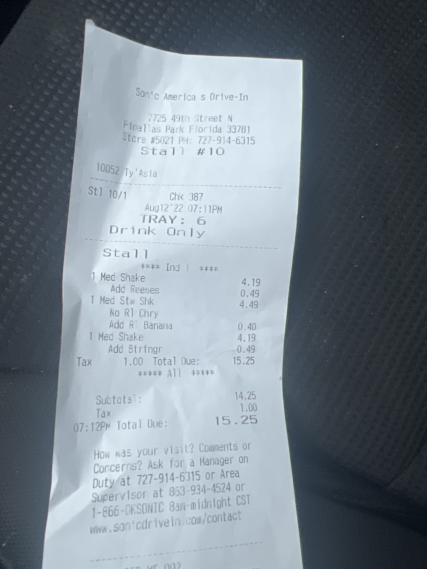 So in closing, I do have to say that I recommend Sonic Drive-In, especially this location in particular for the great service...