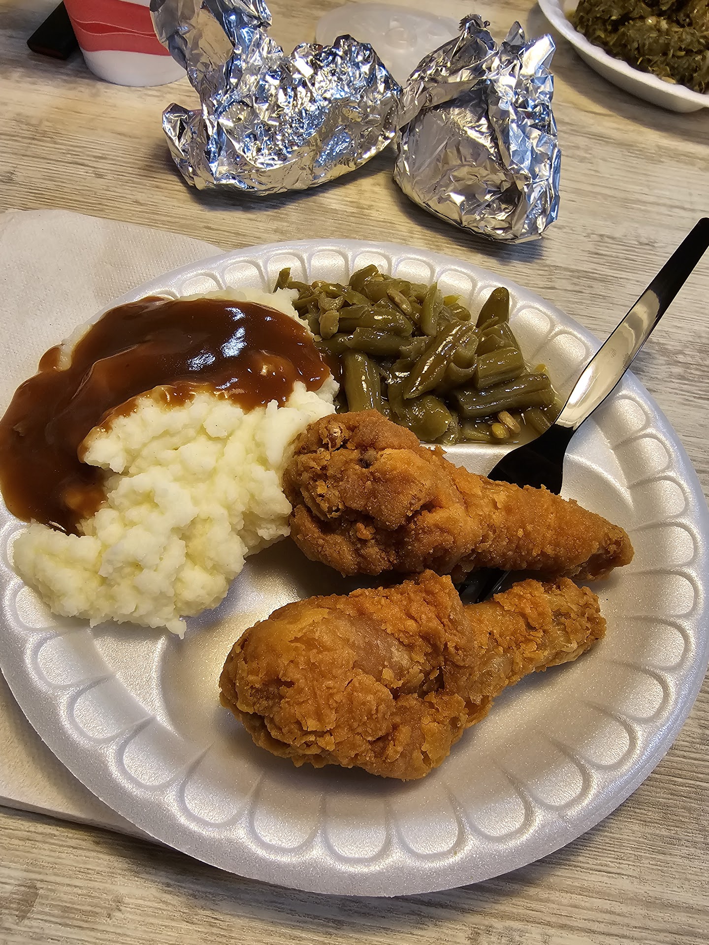 So me and alone of my sons were coming back out of state. And we saw a billboard for Abraham's. It said seafood and soul food so I was already intrigued. Almost salivating. So I put the address in GPS and we were on our way. So when we pulled up. It had a line in drive through. Ok.... then there was aline inside. Ok. And mixed races were inside as well. And that is always a good sign of goid food. Now if a hood spot or hole in the wall spot is not your cup of tea.. this place in appearance could deter you. But give it a chance. So when we went in and ordered.. I was a little apprehensive.. then had stuff made to order. I though maybe it would he dry. And I did t want to wait.. to order something else. So I ordered off the line. Let me tell you. Fire!!!!!. I had their chicken and porch ops and yams and potota salad.. 🔥!!!!! I was impressed for sure. The atmosphere was nothing to brag about at all. And the sweet tea.. did not hit the spot..but I am assuming lemonade is the thing because that was empty. And they are also know for cheese biscuits. But unfortunately they onky serve for breakfast. So I gotta go back for that for sure. But yeah they get the Sickle and ebert 2...