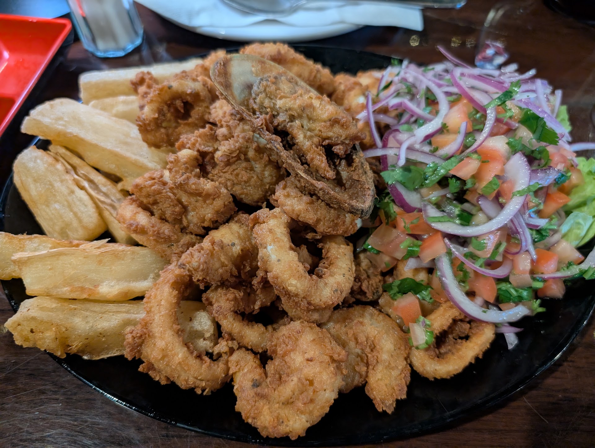 🌑 Walked in restaurant a little before 9pm. No smile or welcome. Just looked at me as if i was in the wrong place. It seemed as if the waiter had a problem with me from the beginning. I came here just for the Whole Fish Red Snapper. Even showed the waiter the picture on their page. I asked what does it come with? She said rice even tho it doesn't say rice in the description. Then she offered beans instead of the salad.
