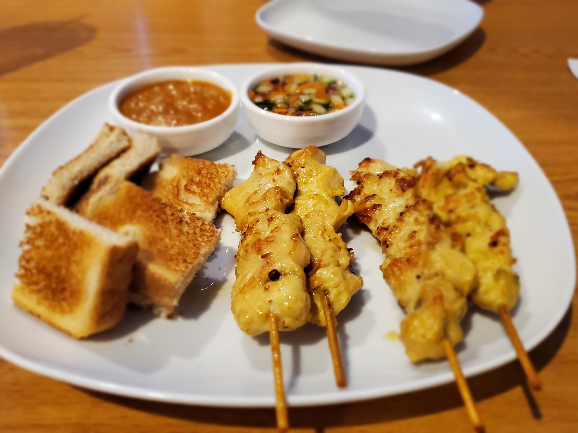 This review is based after visiting this restaurant two times. For appetizers, I had the satay (chicken skewers) and the tod mun pla(Thai fish cakes). Both were good, but I preferred the satay. I found it to be more flavorful and more memorable. My gripe with the fish cakes is that they weren't nearly as good without the dipping sauce.