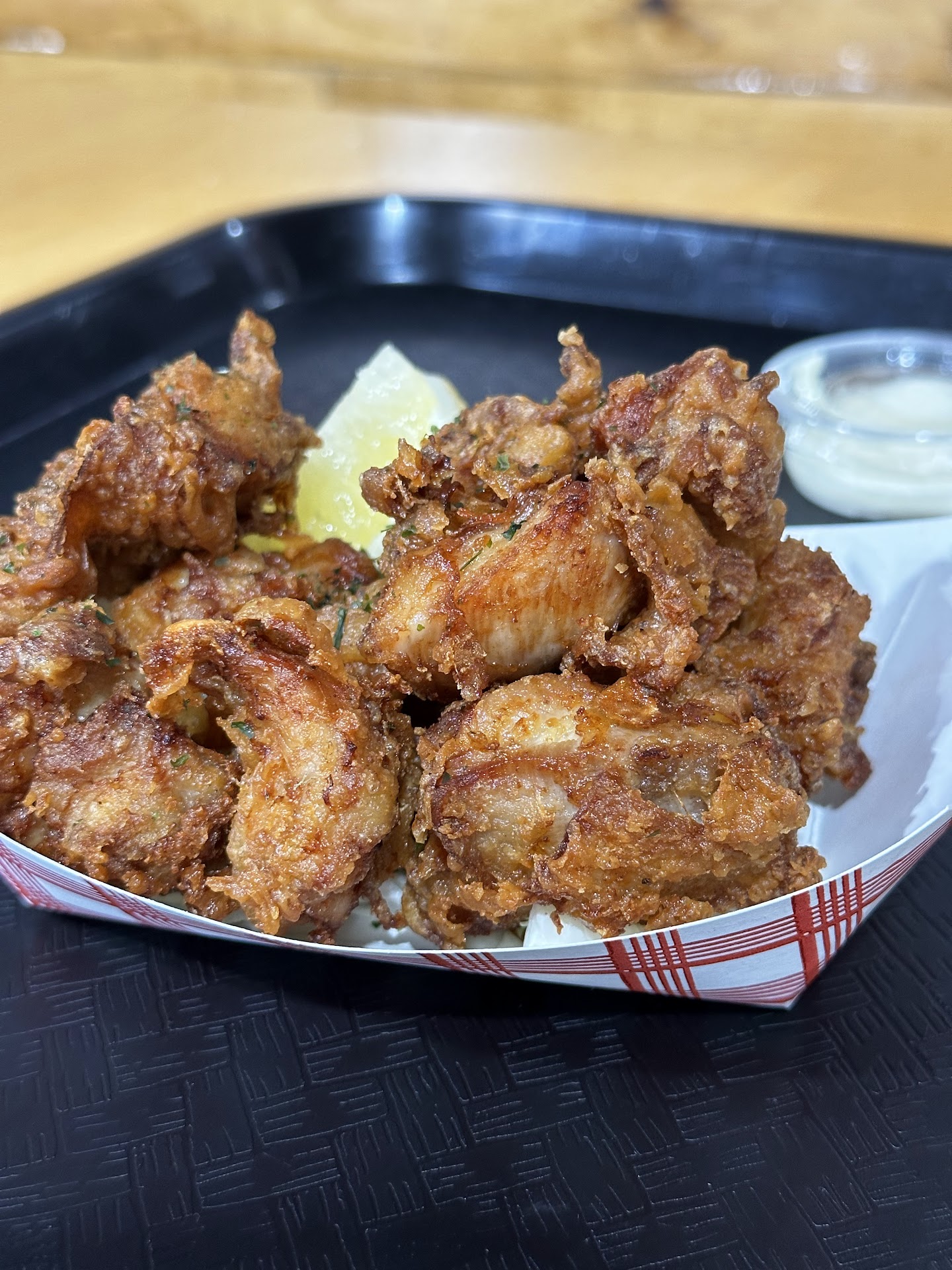 Karaage tasted good, but didn't have the extra crispy outside it is supposed to be known for; with super juicy inside. Some of the pieces were juicy, some were not. Seasoning overall was good though. 3/5 for...