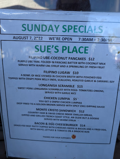 During the pandemic, I had the fortunate opportunity to interview Sue for a project in school. They had just opened a few months before and business was present but slow. A few weeks after the interview, the picture I took of Sue and her daughter was on the front cover of East Bay Times. As things changed into their new normal post pandemic, Sue’s Place continued to grow a community of customers. Parishioners of the church across the street, local government next door, and those who came to check on an old favorite spot to be pleasantly surprised with new ownership and a menu of tasty food that reflects the ethnic makeup of Pinole. Filipino food, classic American diner food, Mexican breakfast food. Very friendly staff. It has that old town Pinole feel (the mural all the locals know is still there).
