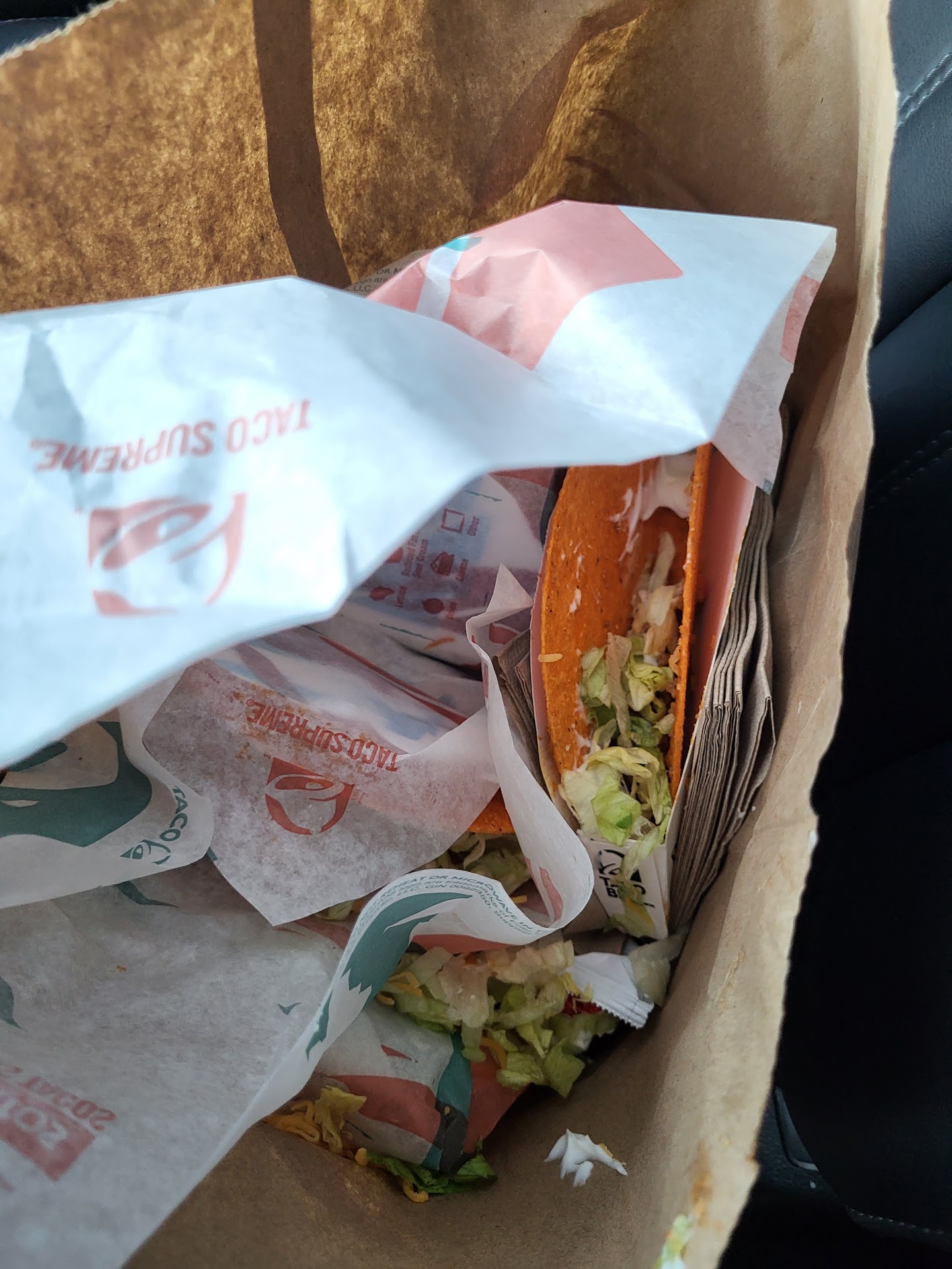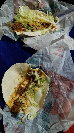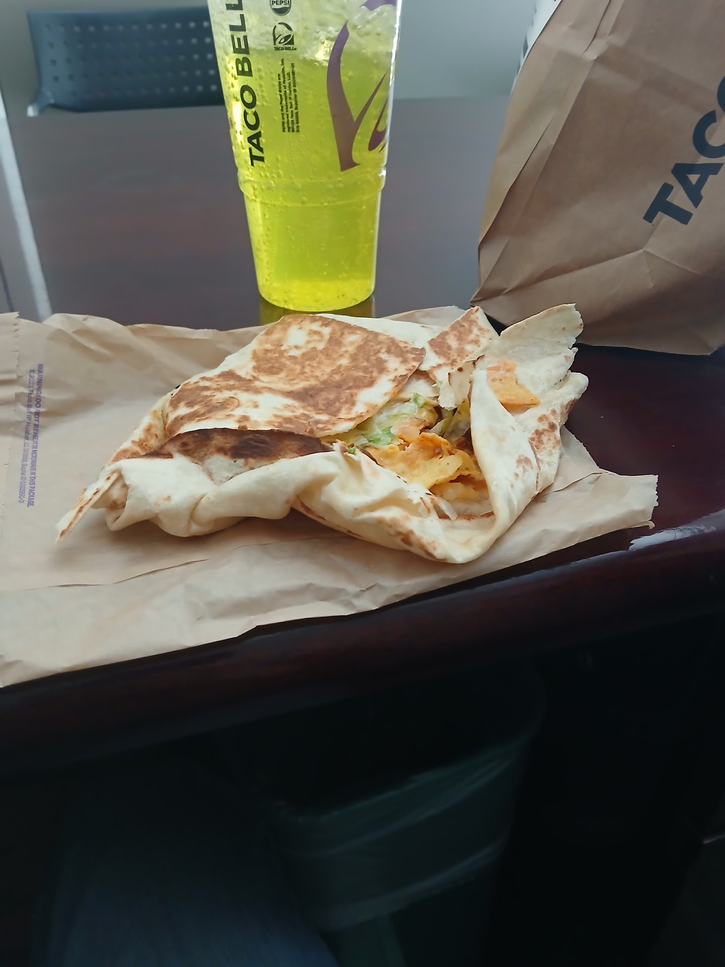 Read moreI work nearby and normally get my food from here. Typically coming in at least 3 times a week, and that's being generous. I had no issues eating here until 1-2 months ago. The first issue I had was that I ate and spit out a plastic scrap that seemed to come from some sort baggie. The next issue was I ordered a crunch wrap with no tomatoes, and I wish the issue was that it had tomatoes on it when I got it. When I pulled the crunch wrap out of the paper bag both sides of the paper wrapper the crunch wrap comes in were soggy with grease. I had to unpeel the crunch wrap from both sides of the wrapper before I was able to remove it. I took a photo of it and will attach it to this review. My last and most recent issue was I ordered two orders of the new dipper burritos. But when I unwrapped them they were more like squished amalgamation of what they were supposed to be. Almost as if they had been crushed or intentionally malformed. As unfortunate as it is I believe I'll have to get my taco bell from another location for a while until the issue is rectified. As there is no other Taco Bell near my work that I'm aware of I'll have to settle for other fast food locations during work hours unfortunately. I hope that one day I can return to...