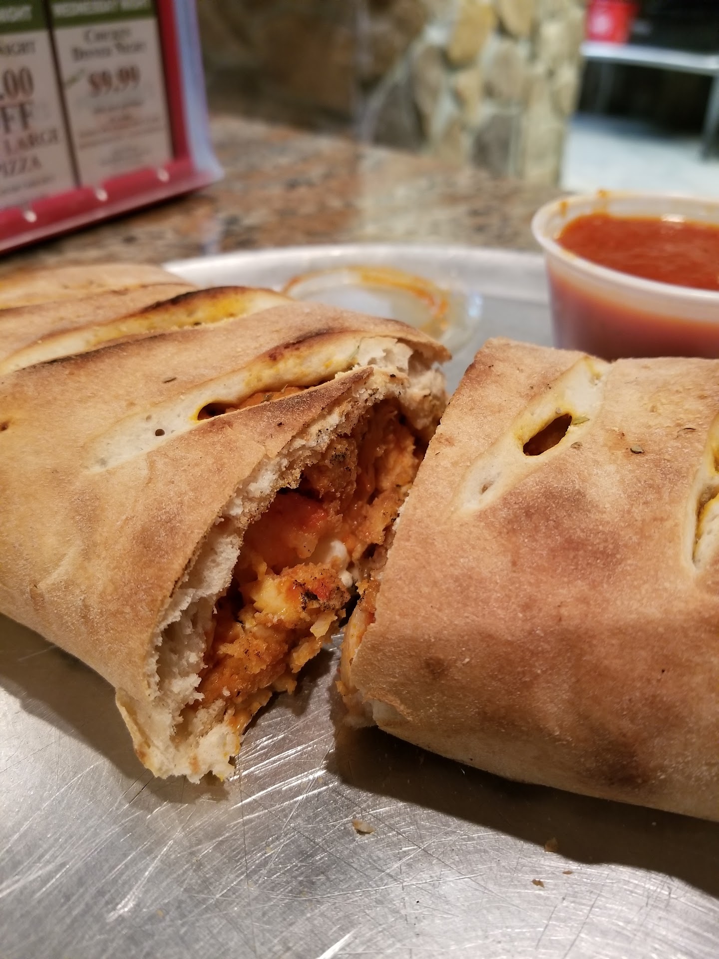 Panatieris is virtually empty with no customers seated and only one person getting slices for his kids. I tell the women that I ordered wings and a pizza and pay for the order. She then asks "you don't want any sauce for the wings?" I reply that I had asked for extra blue cheese. Which she promptly takes 2 blue cheese cups and places them along side my pizza in the box.