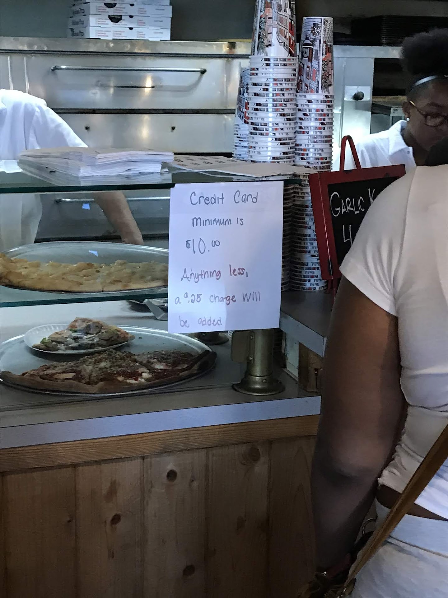 Would’ve loved to try their pizza, however I didn’t have any cash on me and I don’t trust out-of-bank ATMs. Foolishly I assumed they accept credit cards, since a vast majority of people strictly use them. I was half right. They accept credit cards/bank cards but charge $0.25 cents extra for orders less than $10. I’m not one to be cheap, but come on really??!?! Especially since most of the time their customers order less than $10. It was around 1pm on a Friday and they weren’t very busy (wonder why). I will never go back until they remove that cheap policy. This isn’t gasoline you’re selling, it’s pizza on paper plates, so why the nickel and diming? Shame to as I was very hungry but refuse to support unfair business practices. Just get SQUARE or something if your credit card charges are too much. As a small business owner myself I found the sign to be offensive and unfair, especially since most of your charges are less than $10. My advice would be to lower to...