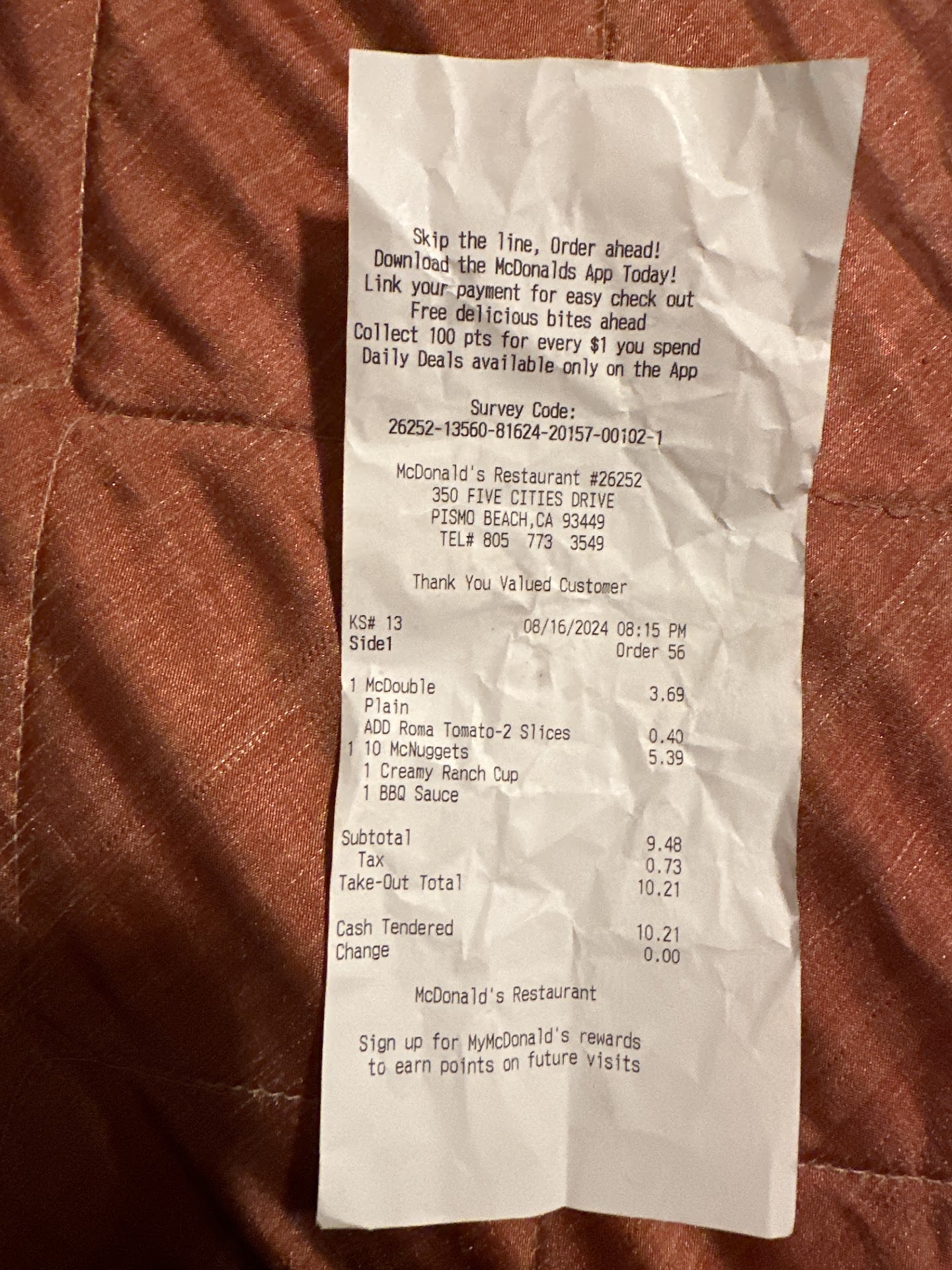 Read moreThere are signs all over the front register telling you to order at the kiosk. The kiosk was broken. After I put in my order, just an iced tea, it said it couldn't take cashless payment and it would print a receipt to take to the front register to pay. It was out of paper. I could have paid cash but it didn't give me any option.