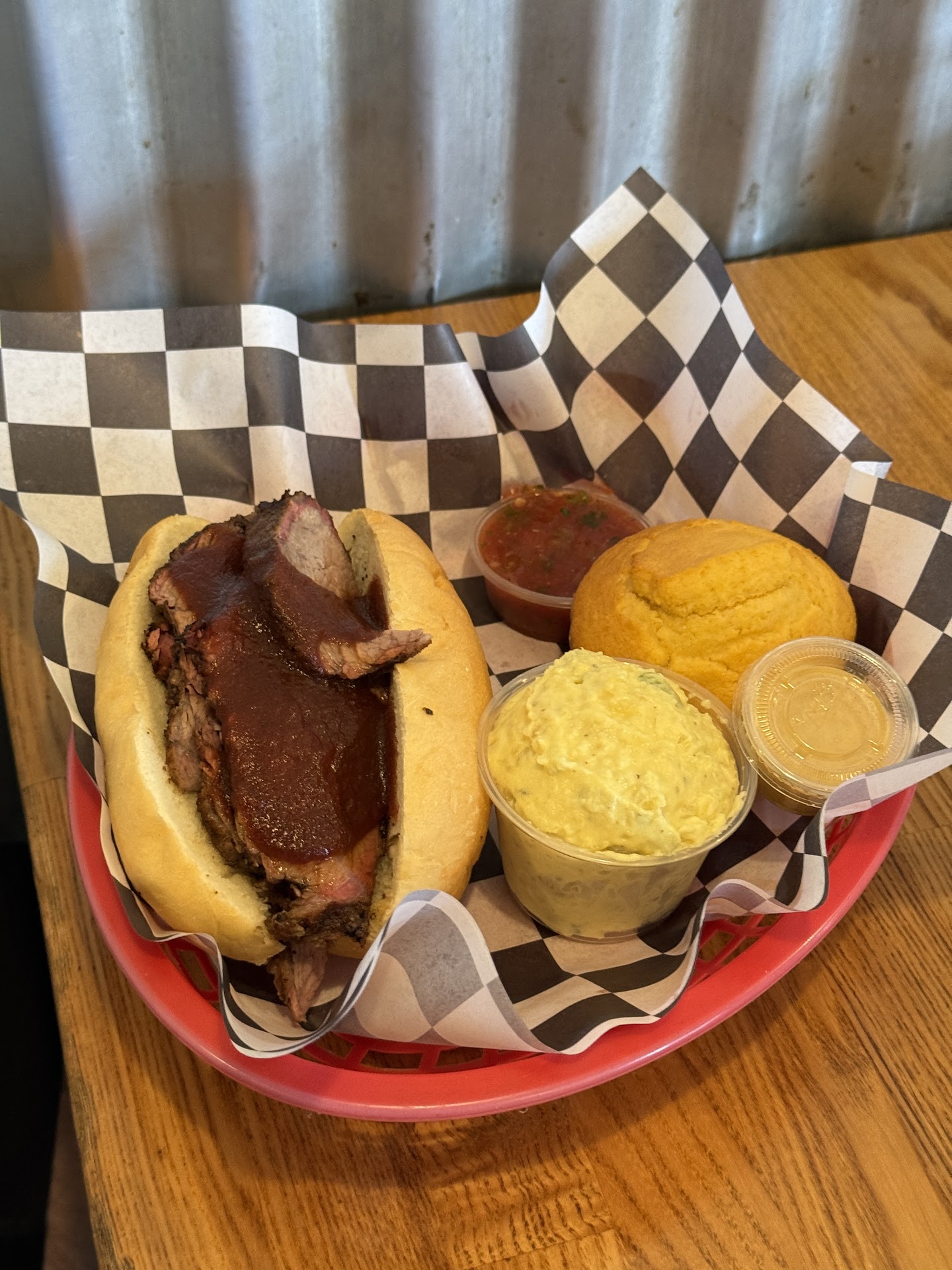 '21/9 1st time customer/review: -- Over the week, had passed by this small, fast-casual restaurant a handful of times seeing it was hoppin', but not too crowded. And, the plastic baskets with colorful paper-liner were stuffed full of meat, coleslaw, french fry goodness. -- This visit met our expectations. Decent portions, meaty ribs, tender shredded pork, fall off the bone chicken. -- The Killer Garlic Fries were amazing. Definitely a sharable basket. Onion rings on the menu as well. -- Well made, crunchy coleslaw. Menu states "B.K.'s Coleslaw" tops the Shredded Pork sandwich (though was in cup on side). Menu states "Coleslaw" as Sides choice, but appears one in the same. -- Sorry greens fans, the only greens offered on the menu ia a Green Salad...besides Fried Green Tomatoes "when available" (but wasn't available our late Sunday evening dinner...nor was the ranch dressing they said "ran out of.") -- Corn Muffin with Honey Butter (small, unassuming--came with BBQ Sampler platter). [Hum, dunno if they actually sell large square Cornbread that's listed under the Sides menu.] -- 4 types of Mo's BBQ sauce is available at condiments station as well as for sale in bottles/jugs for take home: classic, spicy, mustard, and _. -- Self-serve soda fountain. -- Tight, limited seating inside, and only two 2-person tables outside. Bright point is they're only 30 or so yards from the cement public tables on the Pismo Beach Boardwalk (which has formal beach access too). -- Yes, good place bring children (if seating available). Would be difficult to navigate a full-sized stroller or wheelchair through the establishment. Yes high chairs. -- Parking: about that. Good luck. Shop is on small, main street just before boardwalk. Be prepared to park-n-walk. Parking is paid during the day (they push using mobile app, dunno other payment options at individual...