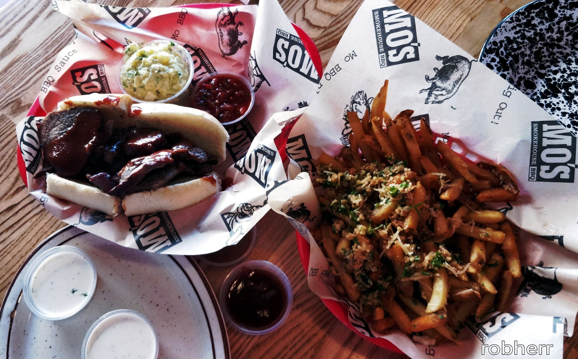 Read moreIs there an award for the best garlic parmesan fries? I'm sure there is. Mo's BBQ has awards on the wall from 1997 through 2007, for various items. My eyesight was not good enough to read each category, but if they didn't win an award for their fries, they should have. These were the most well seasoned garlic fries I have ever had. The fries themselves could have been cooked a tad shorter as they were slightly over cooked, but that was diminished by the overall flavor, and generous portion size. Staff was helpful and pleasant, and there was no charge for a side of ranch +1. Food came fairly quickly with plenty of cooks and servers. There's ample seating inside a well decorated shop, with license plates and photos of BBQ joints all over the South adorning the wall. Four different BBQ flavors which all tasted unique to this establishment are available for dipping, or smothering, which ever you prefer. Regular, Hot, Sweet Carolinas, and Philthy Phil's are the choices, and a mixture of Sweet Carolinas and Philthy Phil's make a very good sauce. If they had won awards for their tri-tip, I wonder if something had changed since 2007. The tri-tip was good, but no better than average. A little on the tougher side, it is what would be expected from a quick cook. Overall this BBQ joint was a fine stop, prices were good, portions were ample, and the fries were really good. No matter what you get, you'll be happy...