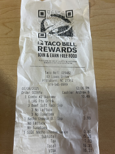 What can you say its cheap fast food with addictive sauces? Pittsboro's Tocco Bell seems to do everything right. They even seem to have less greasy food than a city over? I've been to other Taco Bells that are rather skimpy on one's order. Or at least they make there paper bags absorbent because that is the only paper napkin they gave you for your drippy food. Pittsboro's is different, it seems to have really smart, and happy to be their employees. It's a small town taco bell. I've always been the only one in the drive-thru, never felt rushed. Its conviently on the side of the road, one of those KFC/Tacco Bell together places, block away from Mcdonalds. I would love healthier options. Although on my hour commute I pass a McDonalds, KFC, Taco Bell, and convenient stores/ gas stations. Taco Bell offers a quick vegetarian snack and a friendly smile without leaving my car. Fast service and my order has always been right and hot fresh off the grill. Remember you can order your items Fresco style for fewer calories, or power it up. $1 freezes are my sin on hot days. I justify by telling myself its because my car has no air conditioning and my windows don't work on humid days. But really, its the adult snow cone sweet skidles strawberry or cherry syrups that taste way too good when your all hot and sweaty. They melt into a cold syrup soda. Add water and its like childhood coolaid. They are really way too sweet (at least for me) so order a cup of ice water too. Extra ice if the water bottle you brought with you is now warm from sitting in the car. Keep the to go paper bag clean, they are...