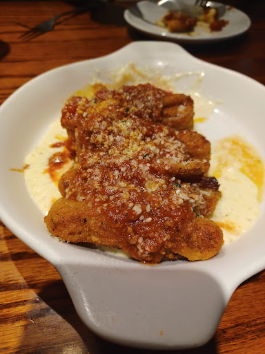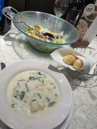 This place has really went downhill. I've never written a review for the Olive garden because it was always decent. I didn't feel a review was necessary since most people do not expect a high-end experience and they do not expect a fast food experience. My last visit prompted me to write a review because it was just the last straw. If I went into my other experiences then this review would take a very long time so I'll just do this one. Our waitress took us to a table where there was filthy dishes and dirty napkins filled with food crusted silverware inside. Also the side of the table had a spilled drink all over the chairs and the ice was still fresh all over the side of the carpet. This was a very busy time of the day but if the table is not ready, why would somebody place people there? We had to go and get a manager considering all the waiters and waitresses kept disappearing for very extended periods of time. The manager came and cleaned it himself. He must have got that waitress because she showed up immediately and before we even sat down we ordered our food. We already knew what we want since we were waiting for an hour. We were told it would be a 40 minute wait and we waited for that time outside. We came in and then had to wait an additional half an hour. This gave us plenty of time to review the menu. I ordered the same thing I always do the chicken and shrimp carbonara with the zuppa Toscana soup. The first thing I noticed about dining in was they changed the decor. Maybe this has been like this for a while but I haven't been in this restaurant since a year before the pandemic began. It felt way more modern and no longer an old Italy feel. They also changed their dinnerware. The dishes were half the size. They bring you one breadstick per person at a time and it takes them 20 minutes to bring you another per person serving. It took us 30 minutes to get our bowl of soup. My son's chicken gnocchi had no dumplings. He got a second bowl and yet again no dumplings. The rest of the food was fine overall but the service was terrible. We only seen our waitress once after our order. She never came by to check up to see if we needed any refills or bread and we never even seen her helping other guests. We seen one waitress helping other tables and she seemed like a good waitress. The rest of the staff was MIA the entire time we were waiting for our food. I realize that there are staffing issues but we seen about six workers standing where the host stands. Why would the manager have six hosts but only two servers? Well it's because those servers kept standing by the host and hanging out instead of doing their job. We know this because we went looking for our waitress because my son needed something to drink. We had an entirely different waitress come and ask us if we wanted a refill so then we thought maybe our waitress went on lunch or went home for the day. But when the machine started to malfunction when trying to pay the bill we had to talk to another waitress and ask if we got double charged. Suddenly our waitresses decided to show up. (Tip time?!) A long with two other waitresses that were standing around doing nothing. I mean this sounds like a "how many people does it take to change a light bulb" scenario. "How many waitresses does it take to run a credit card?" Funny thing, not one of them actually answered any of our questions or tried to help. They just stared like they had no idea that we were speaking English too. We were going to leave a large tip but after our terrible experience we changed the...