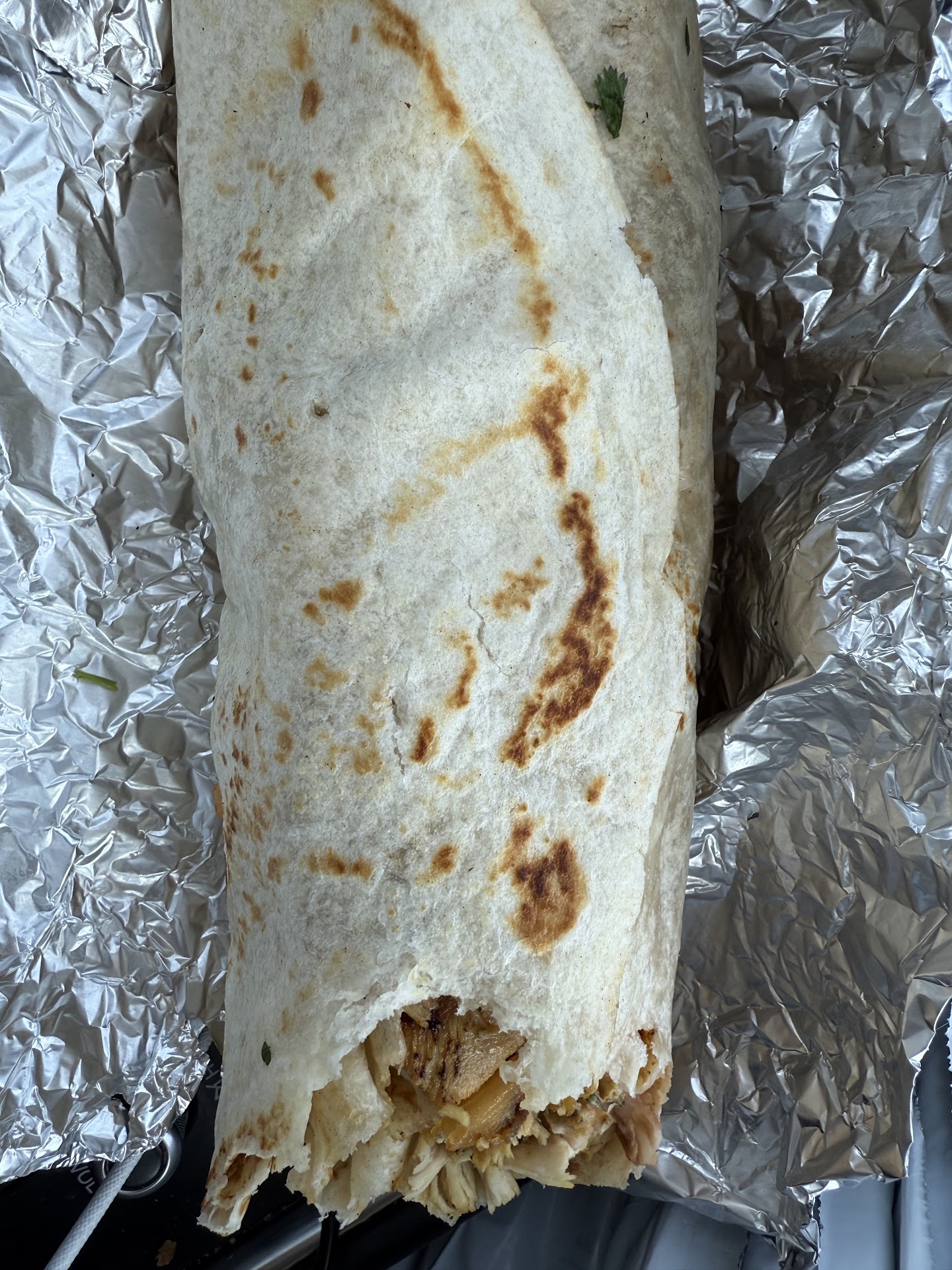 Today I got the super burrito with chicken. It was so good. The chicken is grilled not shredded and it tasted really good. The super burrito includes sour cream and guacamole. I had to open mine up because the bottom was unraveling so I had to reroll it. But it gave me a chance to take a picture of the inside!