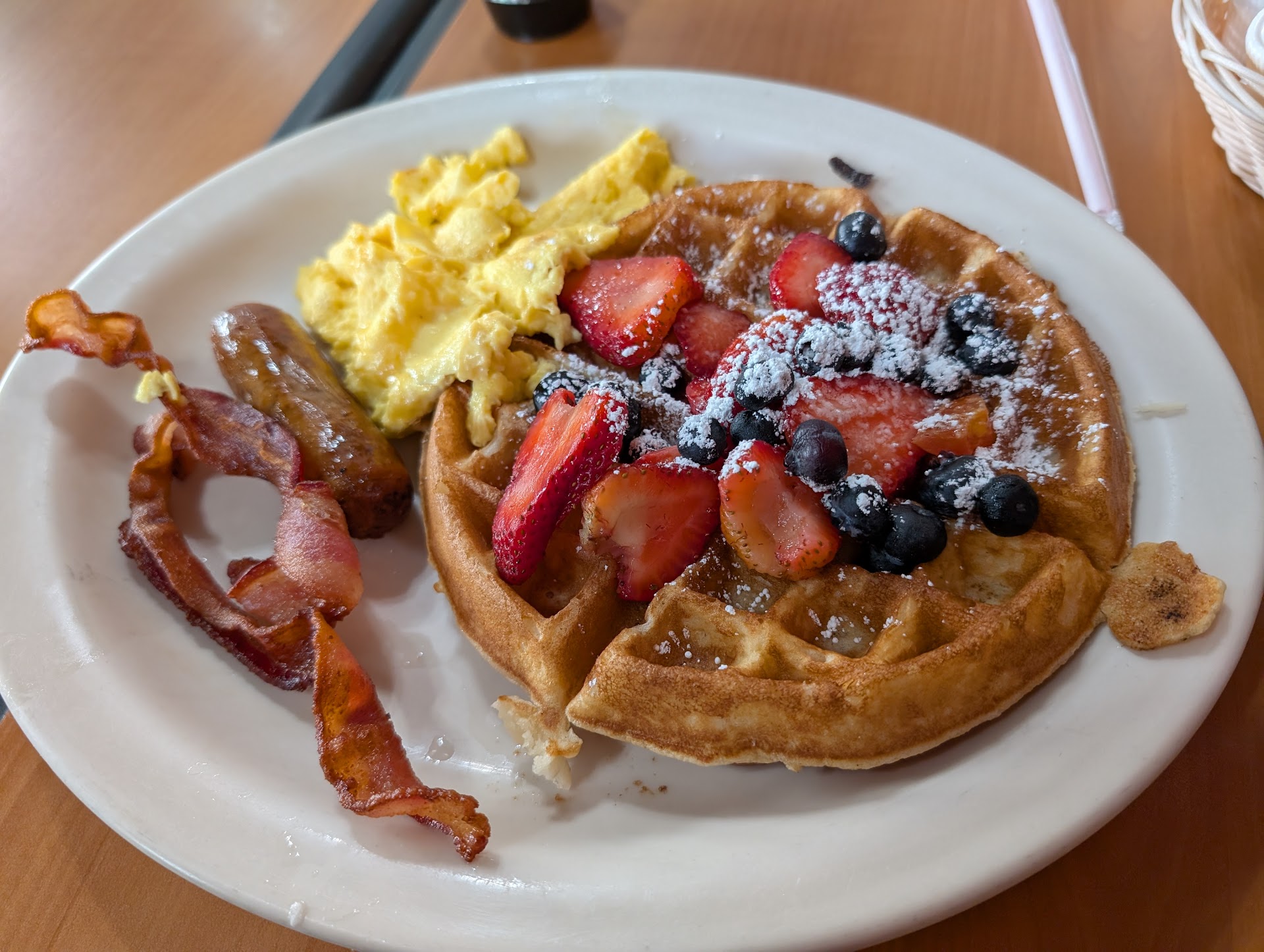 Read moreWhat a lovely little restaurant! Comfy family vibe, friendly staff and great food! The waffle combo with mixed berries was delicious, even in off season for both kinds of berries. And this will seem like an odd note, but I really appreciated that the pepper shaker flowed freely. I like pepper on my eggs (which arrived unseasoned, letting me salt & pepper to taste, another plus) but in so many restaurants the pepper shaker is all caked and either nothing comes out or I have to pound it to get anything. Here a gentle tap and a sprinkle of finely ground pepper came forth. It's a little thing, but attention to the little things is what elevates a good restaurant to...