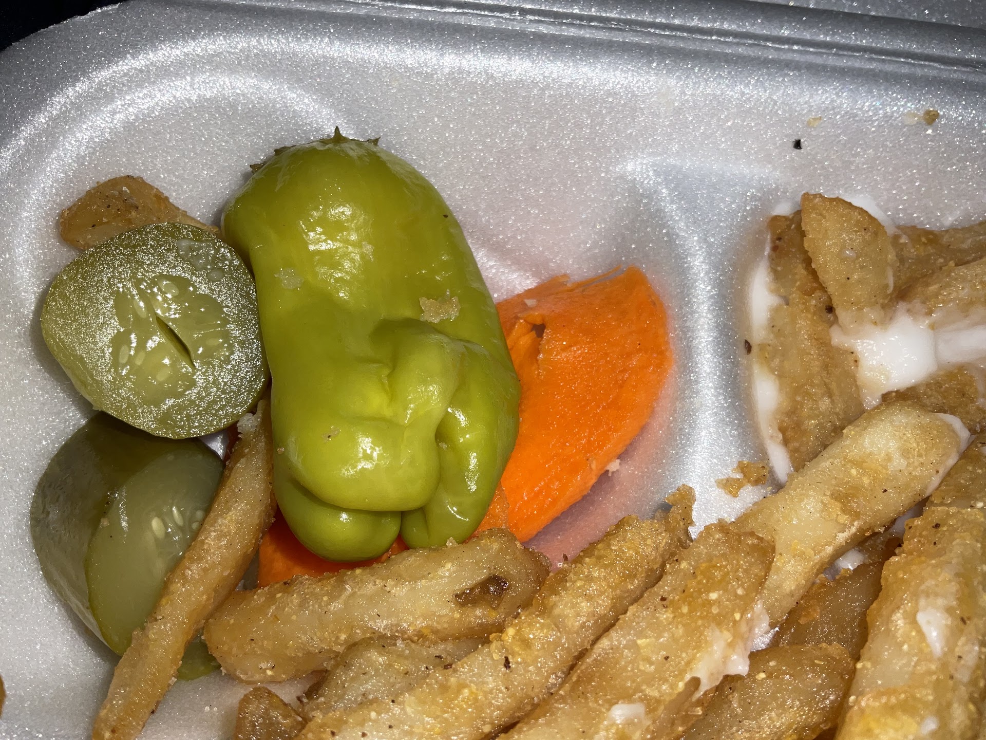 Outside of the wrap, you get a little container of vegetables, like thinly sliced carrots and a few pickles. You also get a ton of fries with the meal. These fries were quite tasty, surprisingly. And I'm not usually much of a fry fan. They also have this incredible garlic sauce, which is used up very quickly. It's also included inside the arabi. I would buy a bottle of that sauce if they sold it.