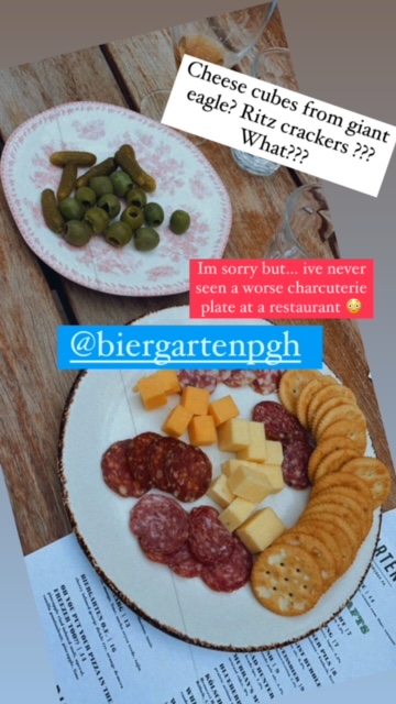 What was AWFUL was the $14 “soft” pretzel that we couldn’t cut through, only to give the cheese/pickle plate a chance, and at $22 it was an even bigger disappointment, which I didn’t think was possible. 3 miniature sweet pickles, a few tiny pieces of cauliflower that were “pickled” but tasted like dirt, a hard boiled egg, and a few small chunks of hard cheese. Small as in the diameter of a golf ball is larger than this cheese was.