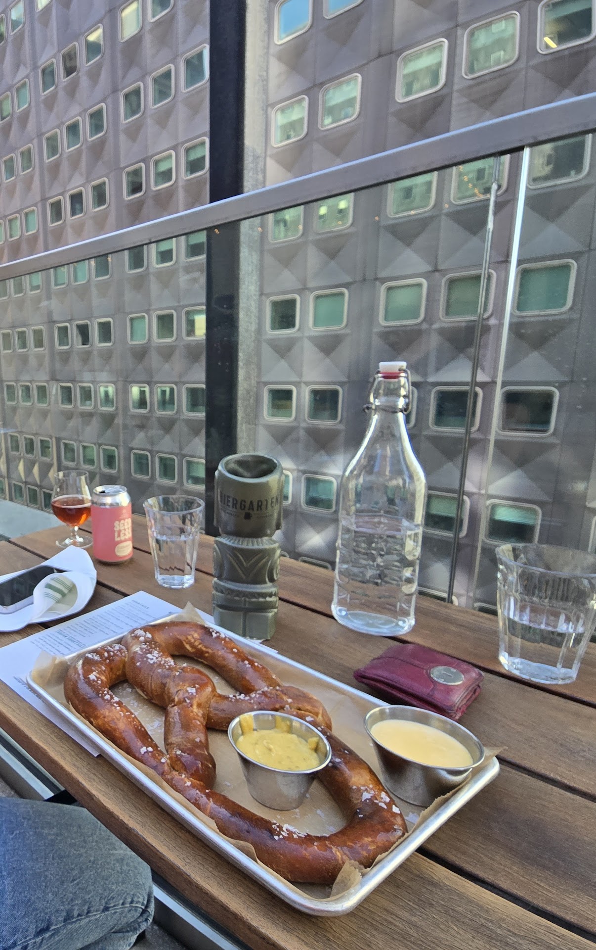 The place does have great location, fun rooftop, fun selection of beer (if you can pick one they actually have) and does serve the most delicious German pretzel. It's more of a fluffy, buttery croissant - than a pretzel. And thats what makes it delicious. I will return - for...