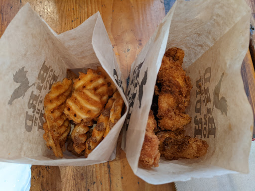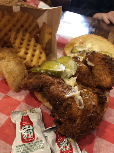 Atmosphere: Small Nashville-inspired hot chicken sandwich cafe playing Johnny Cash, oldies hits, and folk & country music