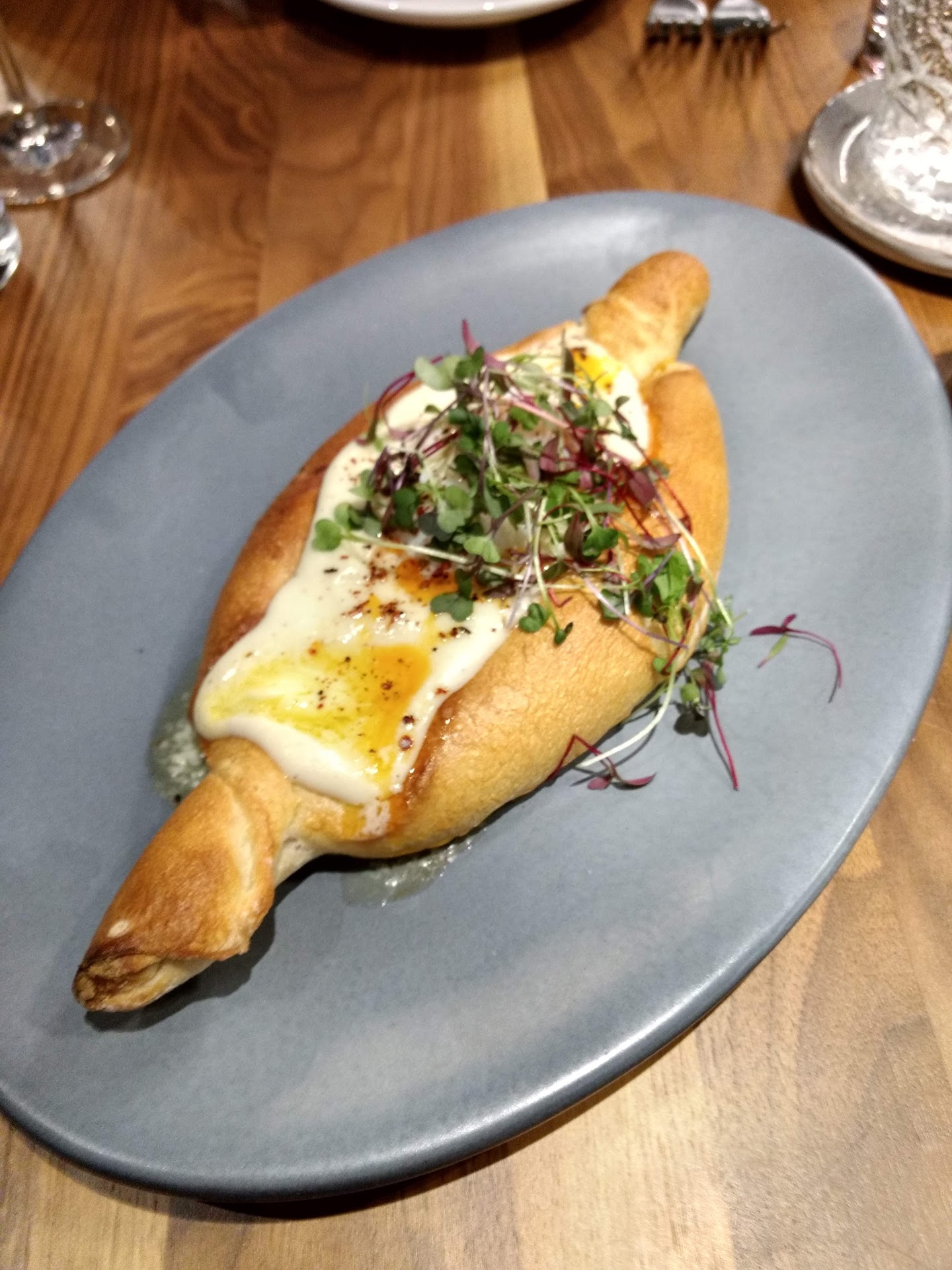 We had the khachapuri which was full of rich cheesy goodness. The bread was delicious and the whole concept of mixing in the yolk was just fun.