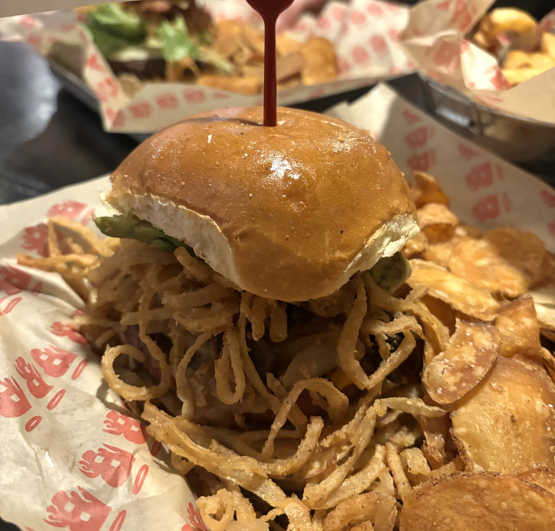 Read moreThe free chips were made with burnt oil that had been in the friers for a month. There was an Asian restaurant in the same place years ago that's where the fortune cookies must come from because they were so stale. I know you're asking what does fortune cookies have to do with a burger place? Nobody knows yet there they are. I will say the one thing they got right was the burgers. This time I had the impossible burger. Very tasty though it did look like a movie prop, almost like it came from a package. I got the bacon Mary. Yes it was a strong drink and worth the cost, umm at the same time it came with cucumber slices that were straight from the end of the bar where they must have sat all day. Oh and the olives were so dry they fell apart before I could even eat it. The following is my review from 4 years ago. They lost a star IMO. I had the Elk pink. Very nicely done, since I got the build it yourself I can't blame them for it falling apart. I was able to not drop and serious amount of food from it, only left a small bite. Parma fries didn't thrill. Chips were typical, only good for soaking up alcohol. Wife was able to get a vegetarian option and not just a vegan burger. Would recommend to a friend. Plus the warm air from out on the...