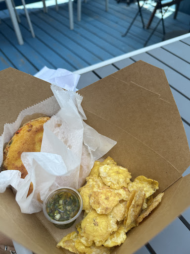 The arepa box lunch comes with an arepa, tostones, and chimichurri sauce. The sauce was pretty good, but they give a very small amount. The tostones were crispy and delicious, and the arepa was pretty good, though I wish there was more creole flavor in the pulled chicken.