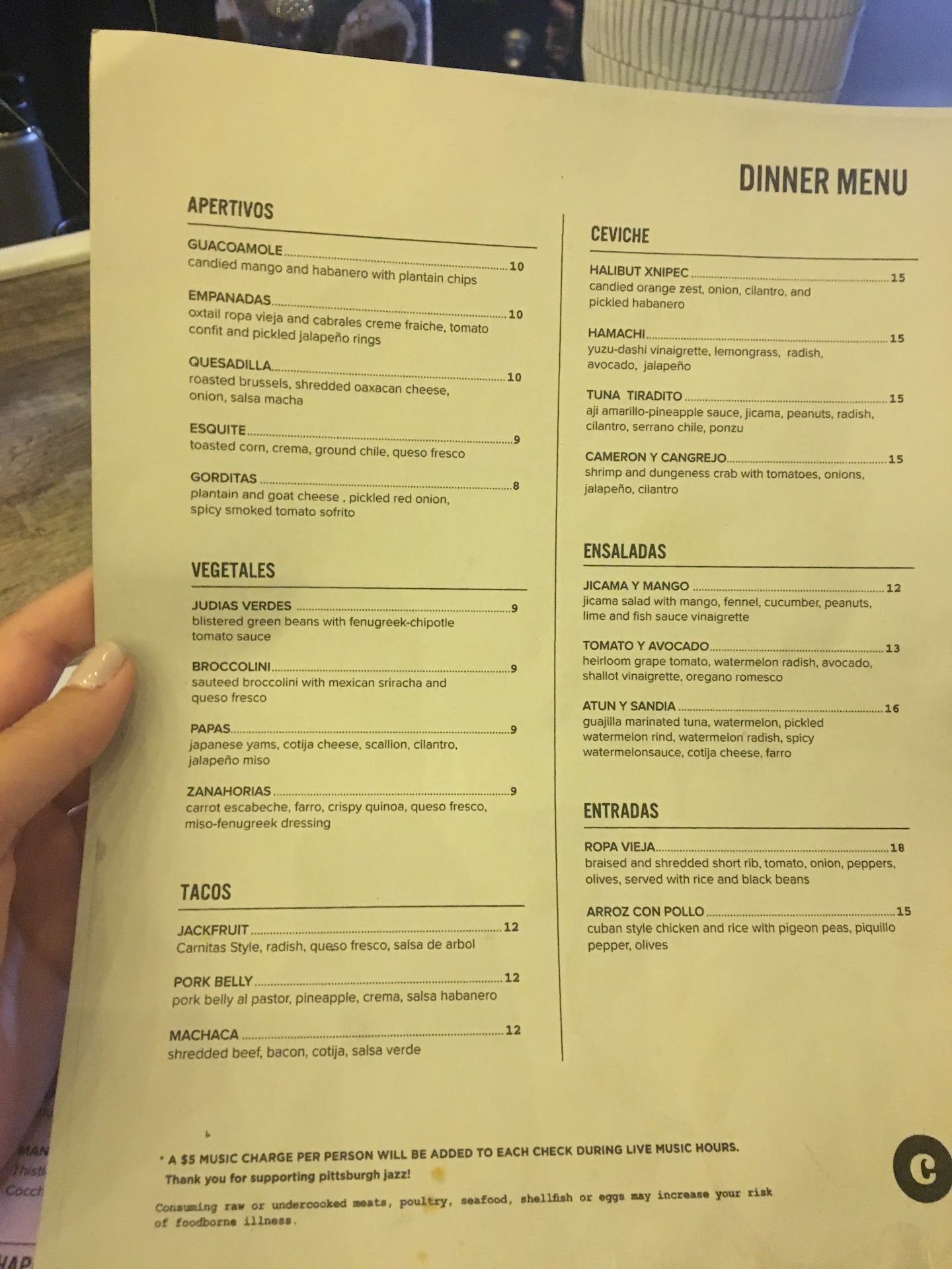 It was $100+ for a beer, soda, app, and 2 entrees. There was not live music at the time (I looked and we had just missed it so they were probably coming out of a very busy night… I kind of get it). There was nice jazz playing (Cowboy Bebop songs actually).