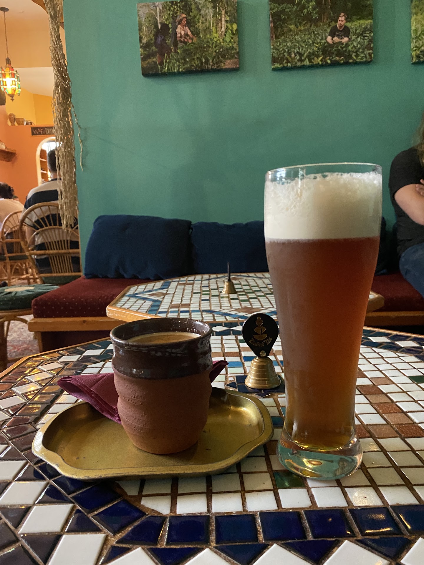 The atmosphere is simply comforting. Whether you want to sit at a table or on floor cusions with ground level tables in rooms separated slightly from the main area there's an area to relax at for everyone. It is very Mich reminiscent of a small shop in India and plays music very fitting to the setting. I see many people bring work computers in and sit for hours, so whether you're a student looking for a quiet place to study, or someone looking to do work in a very peaceful environment, or even someone just looking to hang out and chat with friends this place is for you!
