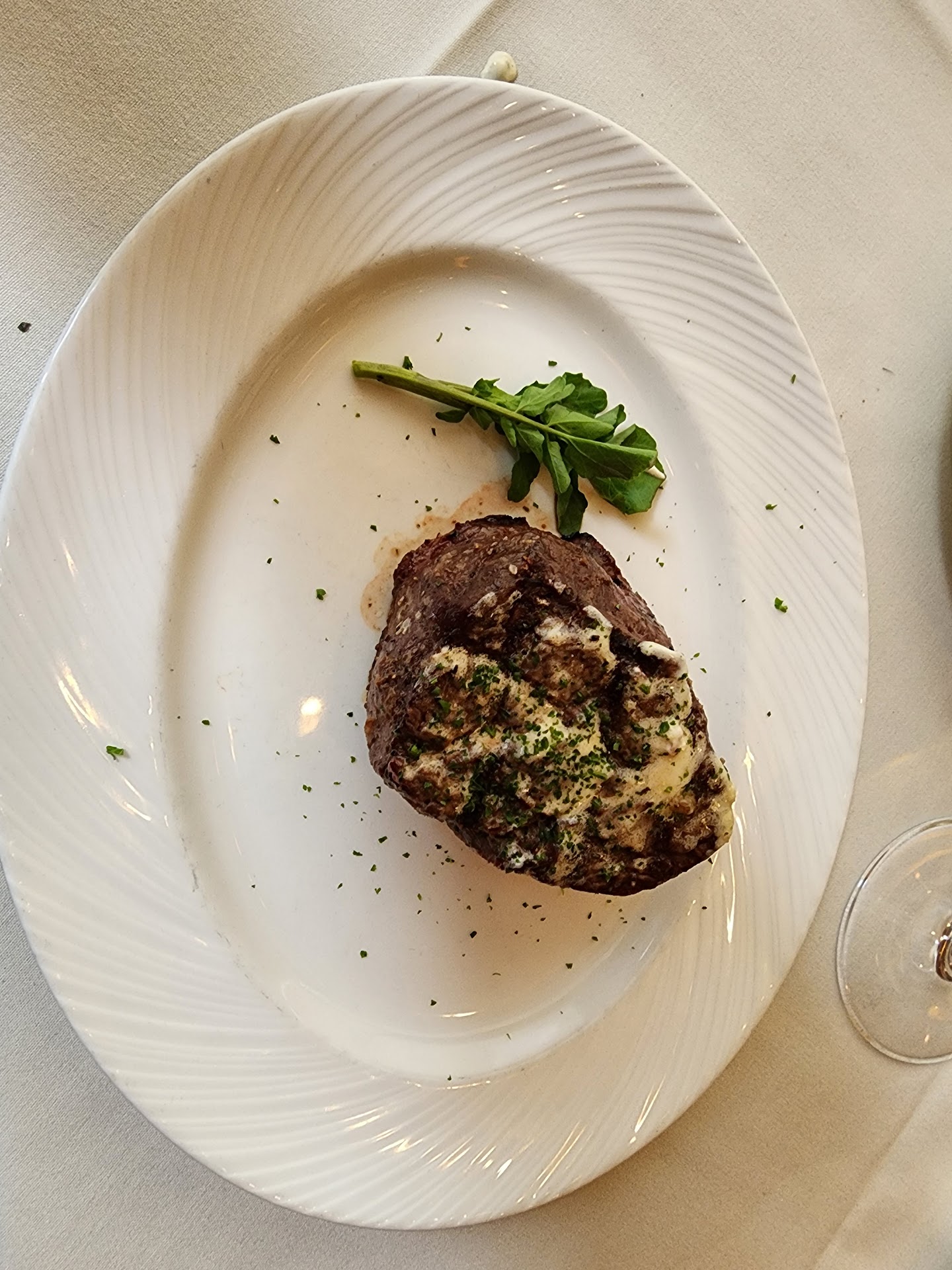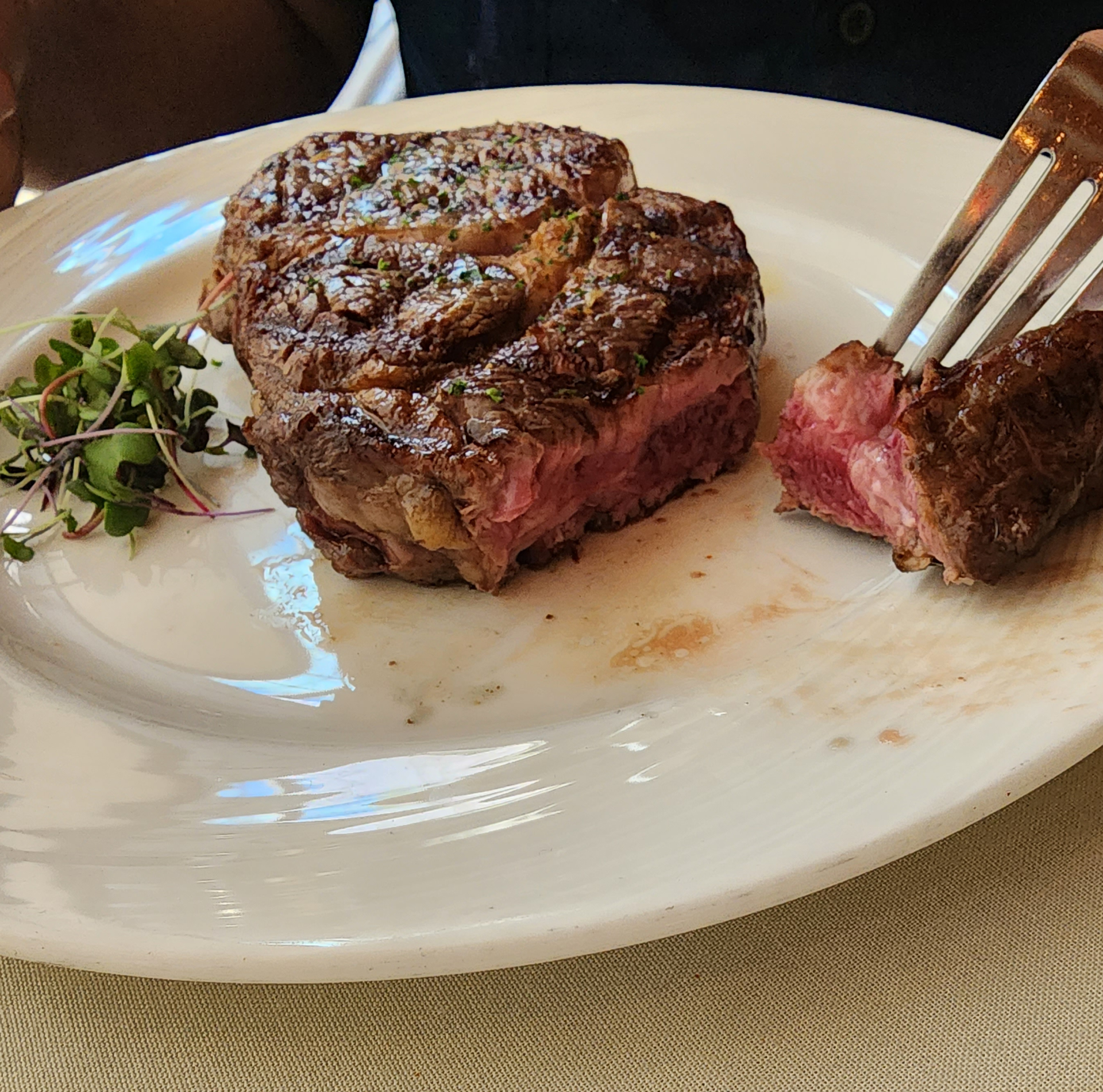 We ordered off the Prix Fixe lunch menu which seemed like a great deal. A salad, entree, and side for $25 per person. Our salads were fine (my ranch dressing was great) and the bread that they bring for the table is also tasty. It took awhile after finishing our salads to receive our entree. We ordered the 8oz strips steaks. We ordered them Medium and medium rare. When we received our steaks they were not cooked evenly throughout and were overcooked. One was medium in the center and medium well on the outside, while the other was medium well and well done. We didn’t want to wait the extra 15 minutes for our steaks to be re-fired so we ate them. Flavor was okay. Still a little bland.
