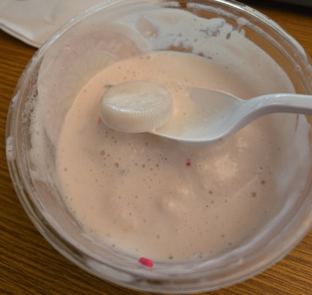 I ate a few bites and stirred it around because it was melting. I found a dirty cap from a bottled water in it! Ew! Gross!! I threw out the rest of the ice cream.