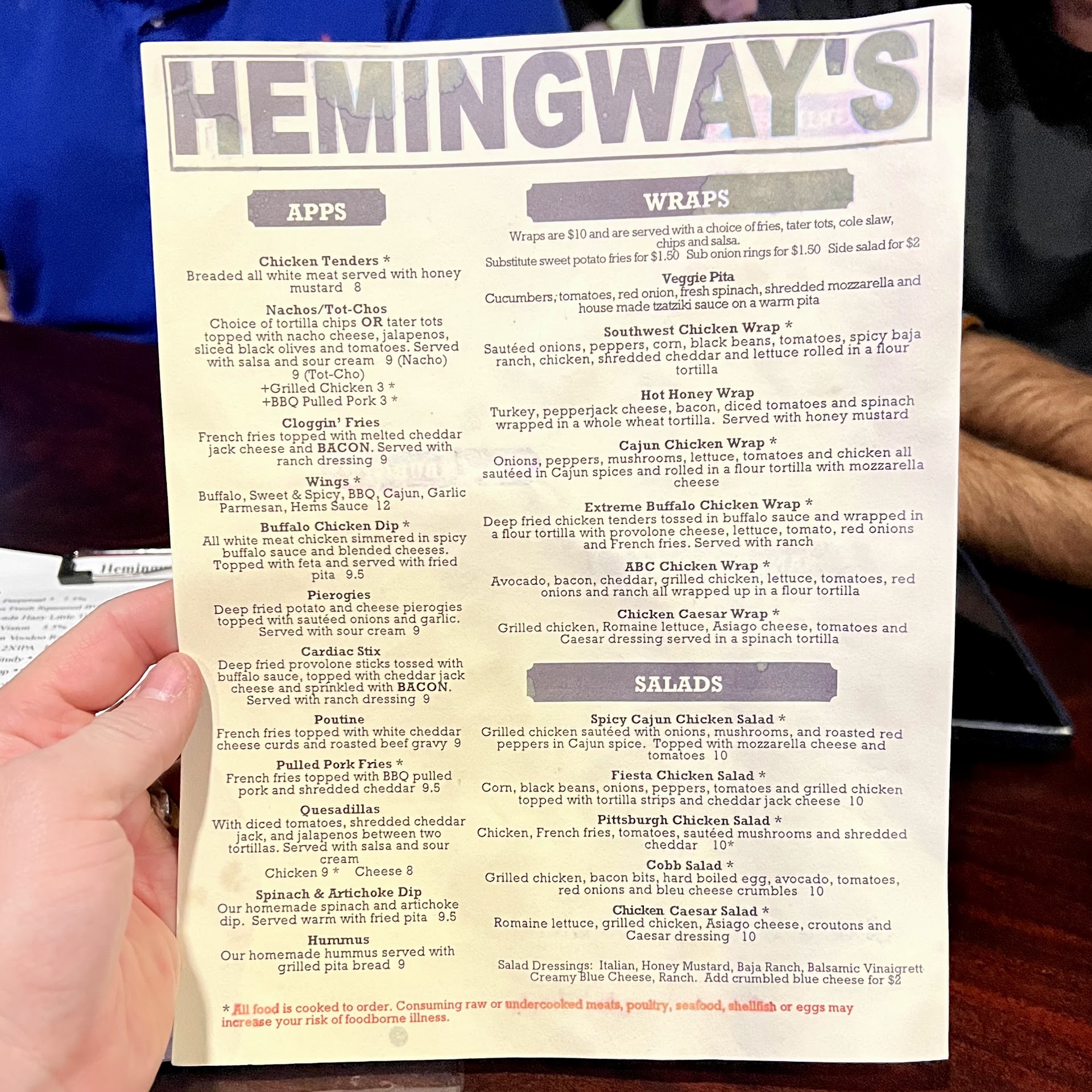Read moreHemingway's is a popular college bar in the city. It's around the corner from the Originals and right by Pitt. The workers are nice, and provide great service! They have many different brands of beer, & cocktails to choose from. The food is delicious for bar food. Atmosphere is calm and simple for this pub. I bring my friends during happy hour so we can order off the $5 menu and get discounts off our drinks! Shot pitchers are only $7.50-$9.50 which is cheaper compared to a typical full pitcher drink. Taylor Swift drink was my first one. Ever since I've loved it! It's so good I had to tell people at school about it. And the drinks are amazing! They even put gummy worms in them!!! We also watch ball games on the flat screen for entertainment. Everytime we go the waiter or waitress assists us and bar tenders make the drinks strong and sweet!! The food comes out fresh & piping hot just how we like it!!!They also welxome a diverse crowd of people from different ages and cultures. I recommend everyone to go to Hemingway's you will...