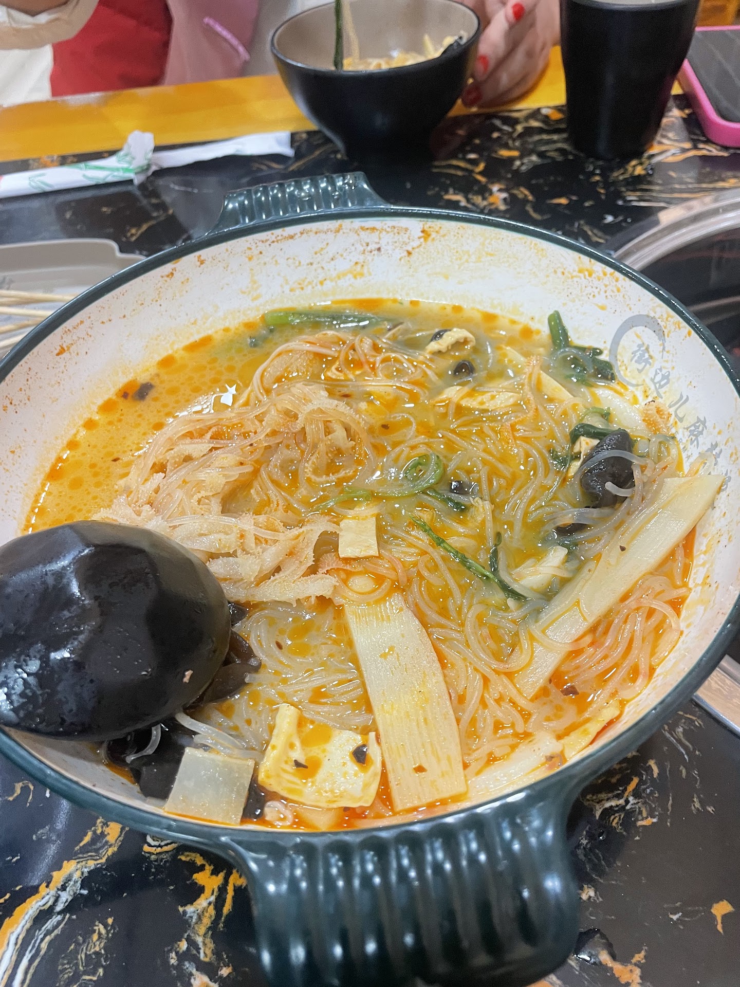 Huge disappointment!!!! We walked in and they were standing around was not even greeted or seated. So I walked over to a table which had a tablet on it which I was assuming you order from it was in a complete different language I had to figure out by myself how to get to English we ordered our food and everything is al a carte. The soup base was nothing but oil and the veggies we ordered were covered in dirt on top of most of it being frozen food. Paid $130 with just my husband and I for a meal that was barely worth $30. Will never go back. Been to several hot pot places and this was the absolute worst one!!!! Don't waste your money. Even the fried rice was disgusting. How do you mess up fried...