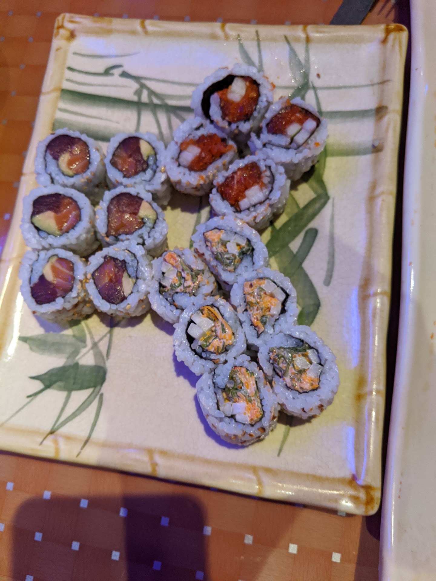 The food itself there is usually amazing but at this visit, the lettuce in the salad was rusty and limp. The avocados in my rolls were brown and even the seafood itself didn’t seem as fresh as usual (although tasted okay and no one got sick). Of course, my entire visit was tainted and my mood ruined given the wet clothes I sat in for the entire meal.