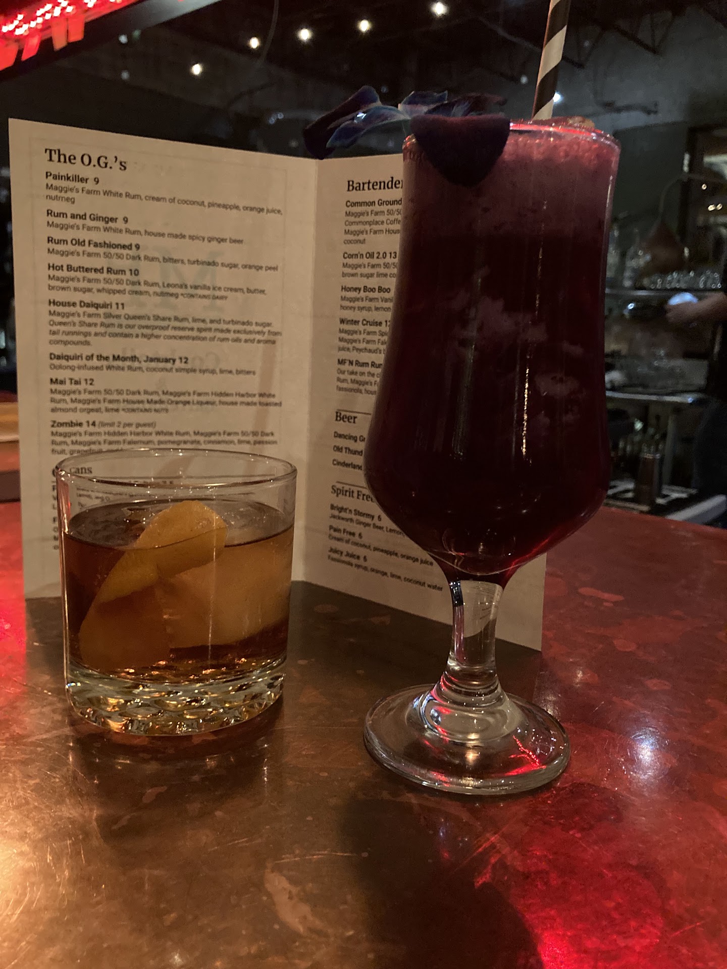We stopped here on a Saturday evening in January. We purchased a whiskey trail pass and Maggie’s Farm was on the list of locations. Because it was in the pass, we thought there would be whiskey and didn’t realize before coming it is rum. Regardless, we sat at the bar and had a rum drink and a mocktail and both were good. The bartenders were busy making drinks. It wasn’t super crowded but all the tables were full. It was a bit dark in the room so my pics are not the best.
