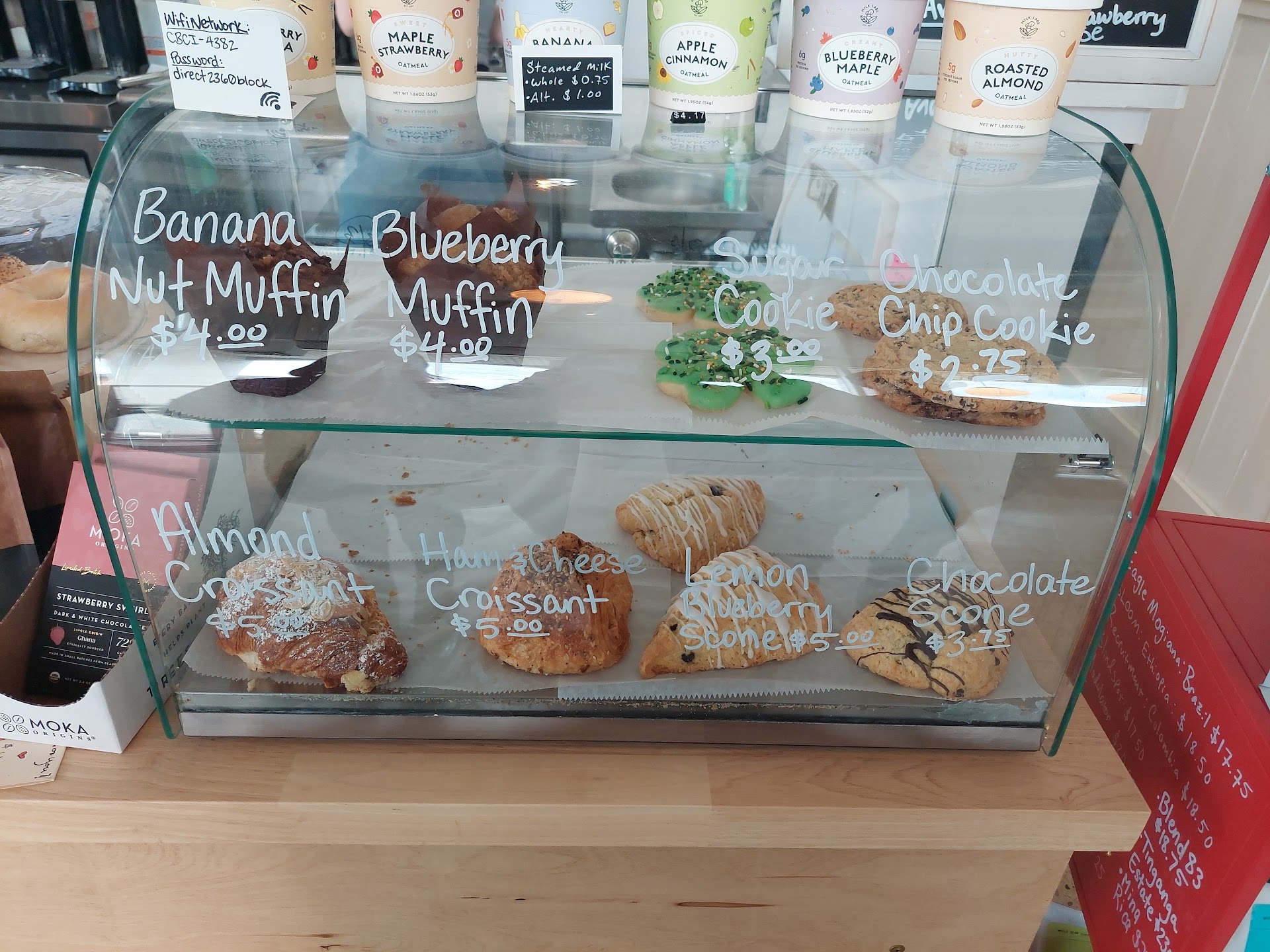 ~Nice little cafe with a plain clean industrial look. There is a regular menu and a menu for the specials. They also offer a selection of pasteries such as muffins, cookies, scones, & croissants. For food there are various burritos, sandwiches, & grilled cheese. Besides the regular drink menu they also have a fridge with things like water, sparkling water, juice, cold brew, & coca cola. ~The lady who took our order was very nice and helpful. Everything was clean and the amenities were fully stocked. Feels like a comfy place to get some work done with all the windows letting in so much light. The seating is about the average amount and there is wifi too. ~Other items they have for sale are coffee beans, coffee making equipment, tea, honey, cups/mugs, branded merchandise, chocolate bars, granola bars, & oatmeal. ~The parking was a bit confusing since there is no parking lot but there is a few parking spots next to the building. However I can't tell if that is part of next door, another part of the building, or for the cafe. Just to be sure we didn't get towed away or anything we played it safe by just paying the kiosk to park on the street across...
