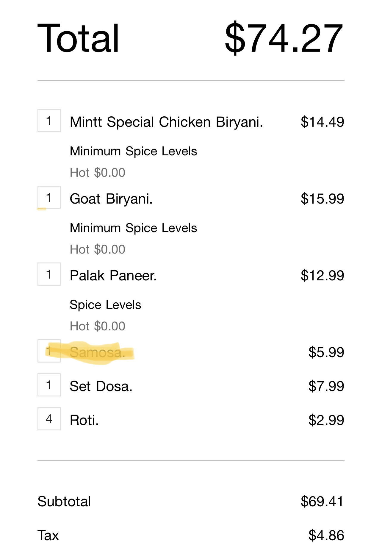 Read moreI ordered take out on Friday 07/12/24 for total 4 items. 1) chicken biryani( medium spicy) 2) chicken Sheeekh kabab 3) garlic and butter naan 4) chicken curry ( medium spicy) .