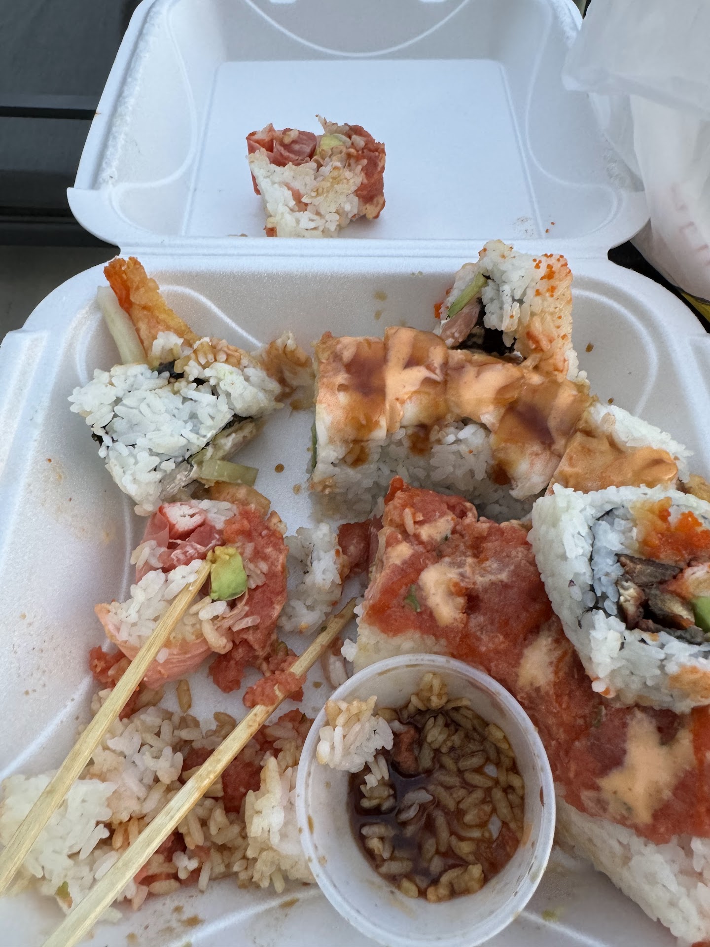 Read moreI absolutely love sushi, so the fact that this place has such a high rating tells me that a lot of people have never really had good sushi. I have eaten from here twice. The first time I figured they were just really busy and that's why my sushi rolls were sloppy big and fell apart. And 90% of it was rice. Also, definitely not fresh ingredients!! I ended up throwing it all away after a few bites because it made me lose my appetite. However, the great reviews had me believing it was not normal to have a bad experience here. And since there is no other sushi restaurant within walking distance from my office, I decided to try this place again a few months later. The second time was just as bad if not worse. The avocado was overripe and tasted bad. And again, the rolls were sloppy big and fell apart. And the amount of sriracha they put on my spicy roll was insane. What I had was a container full of sriracha covered rice with bad avocado and tiny pieces of fish. Wasted money again and threw it in the trash. I will not try...