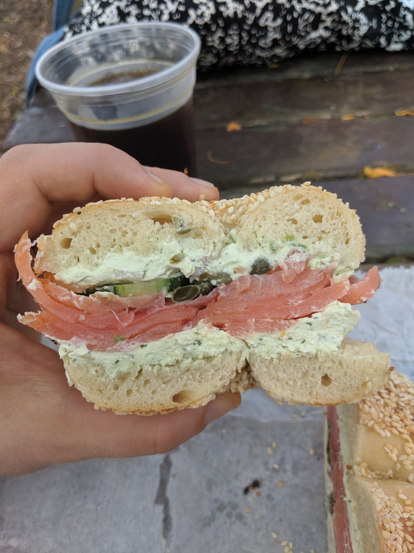 After discussing our options my partner ordered for both of us; one Classic Lox sandwich (lox, herb flavored cream cheese, red onions, and capers) on a sesame seed bagel, and one everything bagel with salmon, plain cream cheese, red onions and cucumbers. Cucumbers are one of my favorites so I interjected at the last minute, “Can I have cucumbers on mine too?”. This was no problem at all, which was very nice. It was clearly a busy morning but the service was patient and really nice! We also order two coffees. One cold brew. One oat milk cappuccino. My partner opted to have the cappuccino served in a handleless ceramic mug which was very well made. The cappuccino was also very well made.