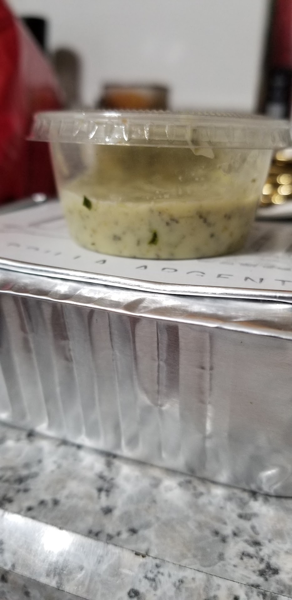 First part is minor but shady in all. 1)Pictured below is the basil aioli that is served with a french fry appetizer. We asked the hostess who was also helping wait on tables if we could BUY some of this aioli. In a roundabout way she basically said no but they could give us a couple dressing cups of it to take home. We asked our waitress to box our FF and to pack a few extra sides of the aioli. Then not our waitress, but the hostess comes out with our FF boxed and in a bag. We get home and this is literally how much she gave us. We cant help but think she did this on purpose. Im not sure what point she was trying to prove or what she thought we would do with the aioli other than....eat it. Im also not sure why we couldn't buy a few sides or a tiny container 🤷.