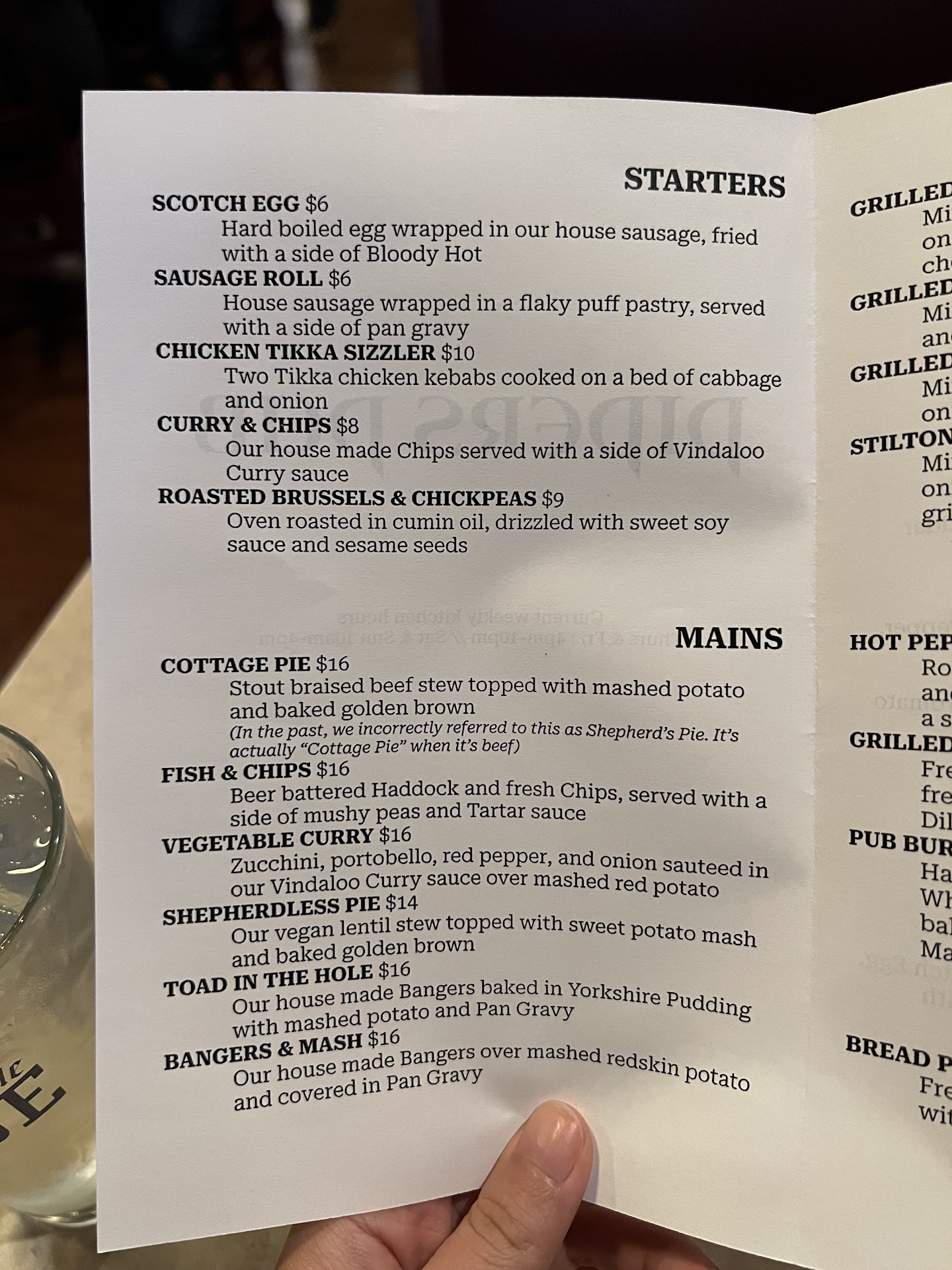 We came into town starving, which is the only reason we ate almost all the food. Here are some specifics. We started off by sharing a Scotch egg. Between the 4 of us we didn’t want to finish it. The egg was over cooked turning the yoke green and the sausage around the egg was undercooked and still pink. The spicy dipping sauce was not complimentary at all. We ordered some mimosas which were clearly made with concentrated OJ. The waitress really talked up the shepherds pie and the cottage pie, stating that they’re made in-house and the process takes two days. 2 of us ordered the cottage pie and the beef was absolutely dry. I guess that’s what happens when you cook it for 2 days. Not a hint of salt in the dish, literally had to salt every bite to choke it down, and hardly any mashed potatoes on top. If you’re on a low sodium diet this is the place for you!! One member of our group got a chicken sandwich and spent a lot of the evening running to the bathroom.
