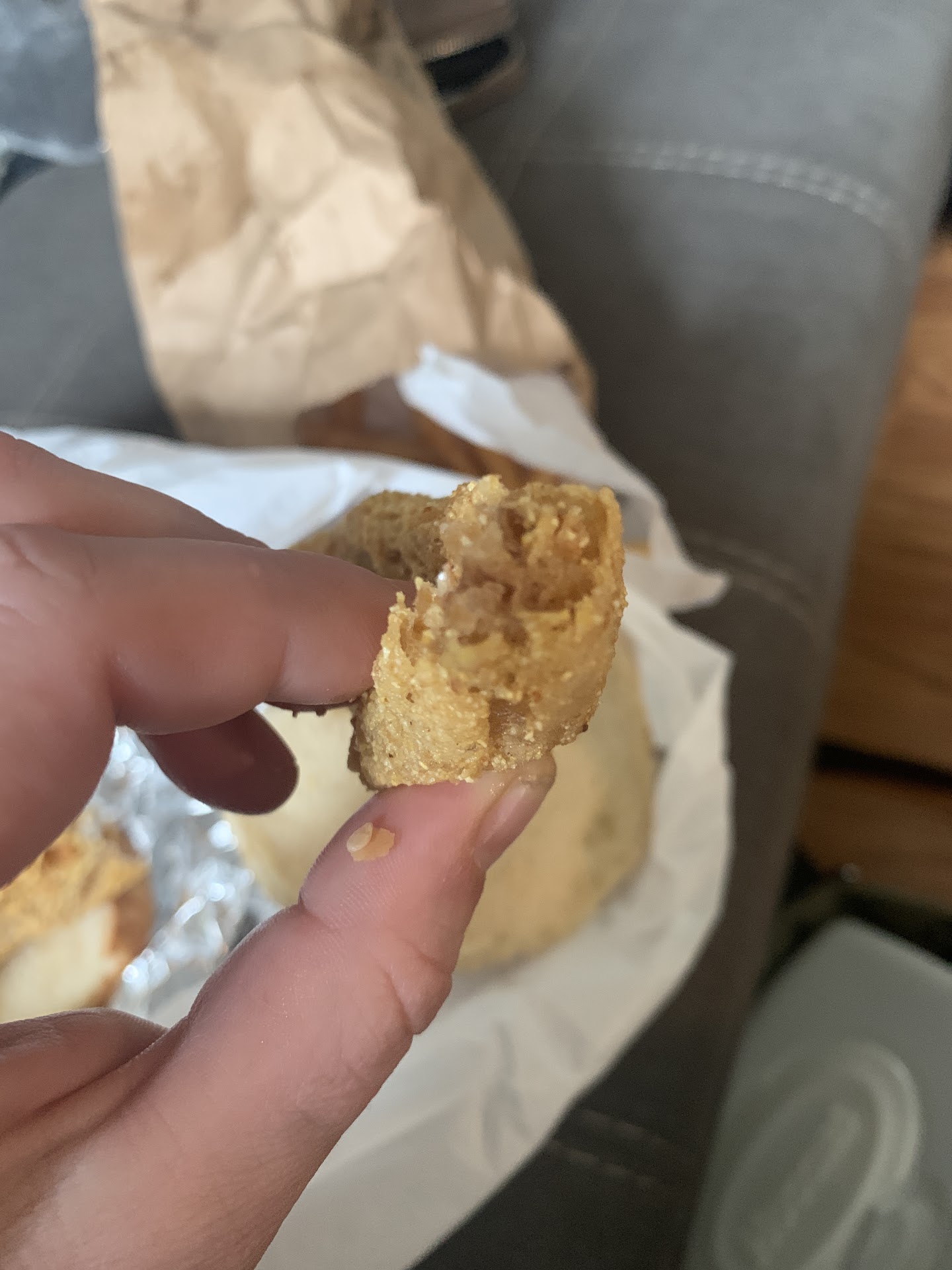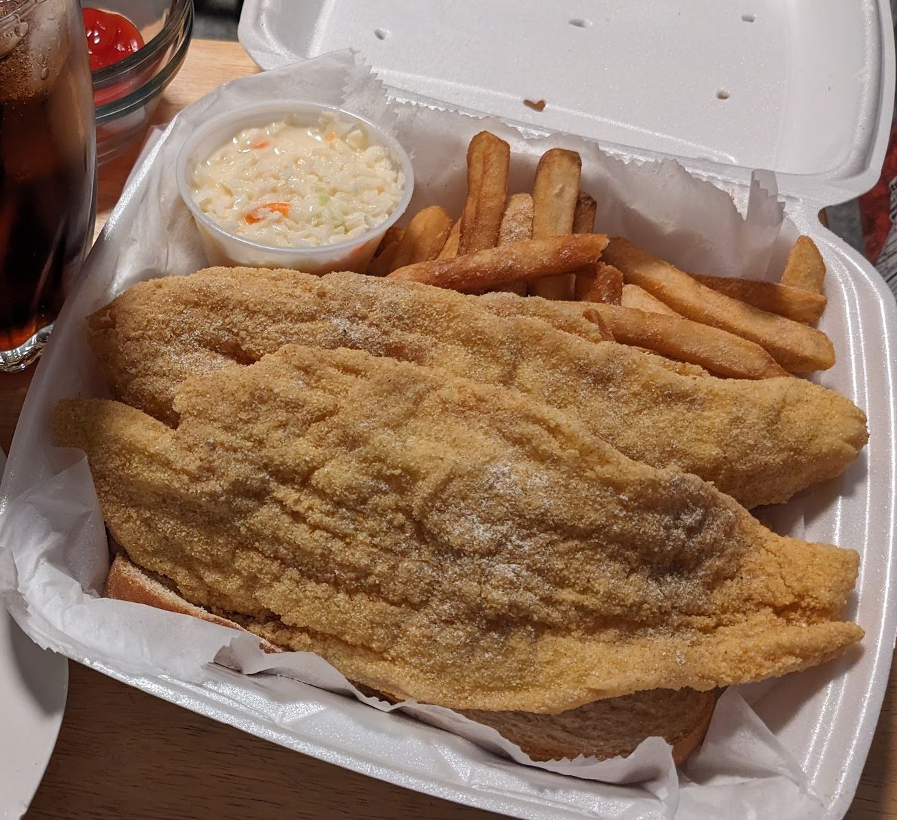 The chicken tenders were delicious! They were big and meaty and the batter crust had a nice peppery flavor. I loved the fries, too. The catfish I wasn't crazy about. It was well cooked, but that cornmeal it was encrusted with didn't have much flavor. It could have used some seasoning or something. The bread that came with the combo was literally just a slightly toasted (barely singed) slice of white bread. Not sure why they bothered to include it.
