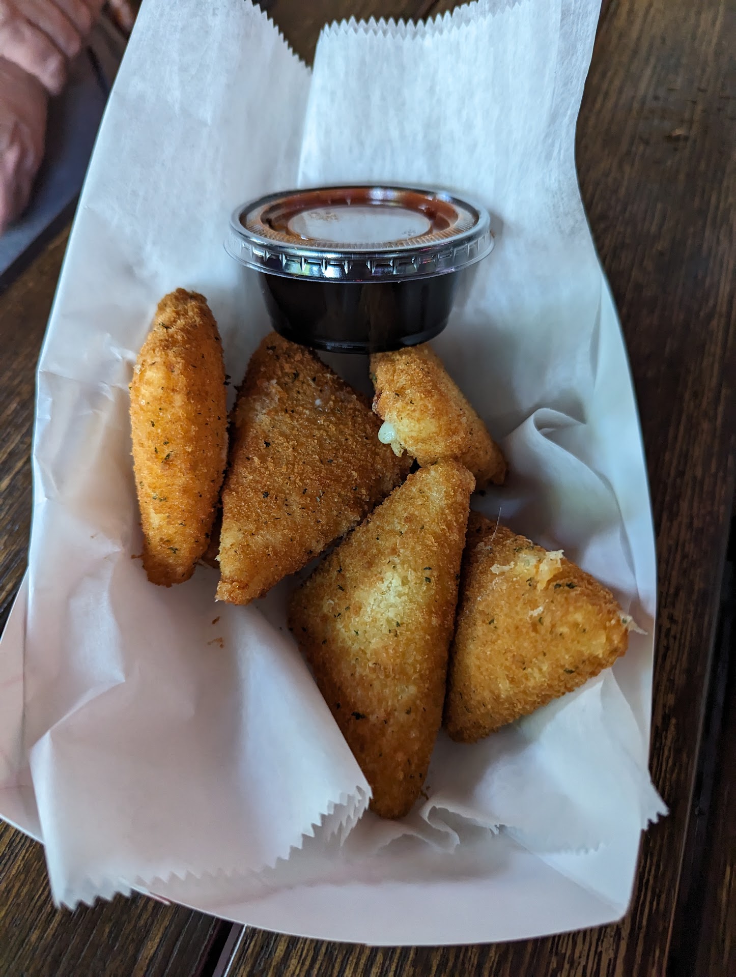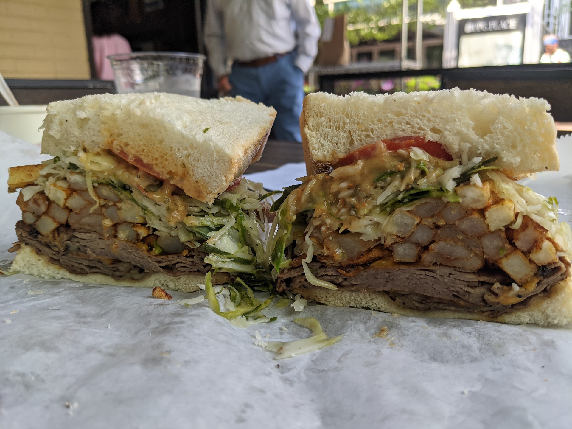 My wife and I split the Double beef and cheddar which, you guessed it, has double the beef and cheddar with a horseradish mayo, tomatoes, fries and homemade slaw on delicate white bread. The meat was juicy and everything went well together. As you can see in the picture, there were plenty of fries and meat mounded high! The bread was soft with a delicate and flakey crumb and compressed easily when you grab it but made it easy to eat and didn't fall apart until the very end. There was plenty of tasty sauce and the sandwich wasn't dry at all. The slaw was homemade and vinegar based and complemented the sandwich perfectly.