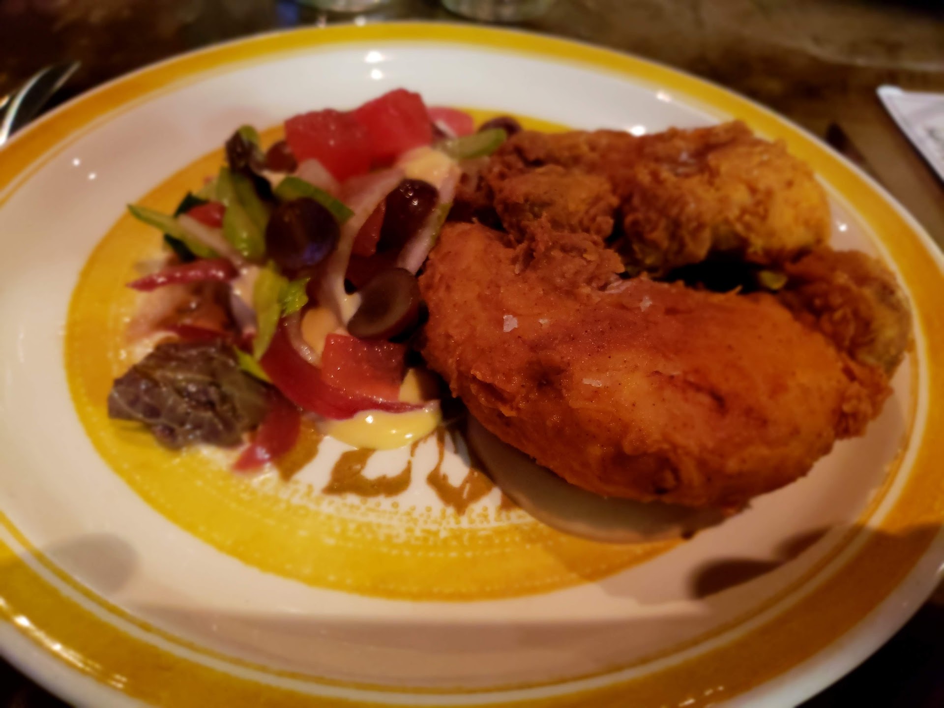 The main courses were less remarkable. A few of our party ordered the cauliflower "steak." Instead of some sort of flat slice of cauliflower, as you might expect, it was basically half a head of cauliflower. Great for quantity, I guess, but there were complaints that it was undercooked / tough in the middle. We also tried the Southern friend Cornish hen (in the picture). As promised, it was breaded and deep-fried. It was tasty, but in retrospect I felt like the breading and the frying overwhelmed what's a pretty delicate base ingredient. The watermelon and pickled vegetable salad served with the Cornish hen was a real standout, however. If they offered that alone, I'd definitely order that again.