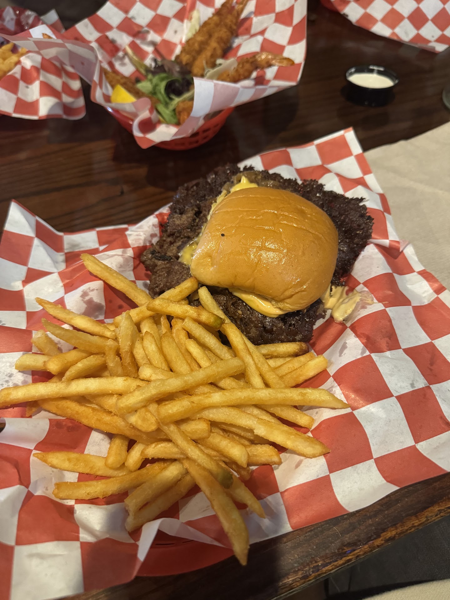 Quality of the burger is a tad bit lower than your average burger, nothing special. The edges on the patties are super crispy where they are almost burnt.. once you clear that and get to the bun area, itâs get better. Very basic burger and fries cost roughly $18 no drink. Burger doesnât even have lettuce tomato pickles etc⌠just caramelized onions and their sauce. Shrimp basket was alright.