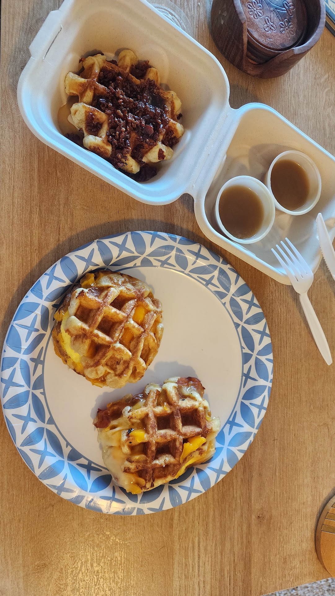We stayed at the hotel across the street and chose this place mainly for convenience but we were so happy that we did! We placed an order online for pickup and went with (2) Chatty Patty sandwiches (sausage patty, egg, and cheddar), (2) sides of tots, (1) pumpkin spice waffle, and (1) fruity pebbles waffle. The price was decent especially for all that we got and drinks!