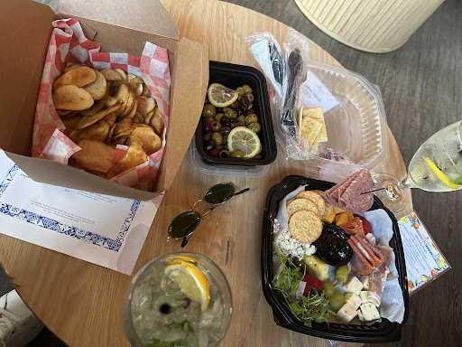 Stopped here in a Sunday afternoon for drinks and apps. There was a guy checking ids who let us know that he didn't care what kind of card we showed him, he's in a mood. Owners know it's his only day off, he doesn't even work there, he doesn't know anything about the bar etc etc. Orders are made via QR code, we ordered 2 Hugo Spritz which were actually pretty good and we got the lemon pepper chips, the charcuterie and cheese and the olives. Our order took a really long time to get to us and was served in all take out containers. It was cheese and crackers not charcuterie and yes there's a difference and should be priced as such. The chips were okay but didn't taste like much of anything. Worst part of the experience is closing the tab online and being hit with an 18% service charge.