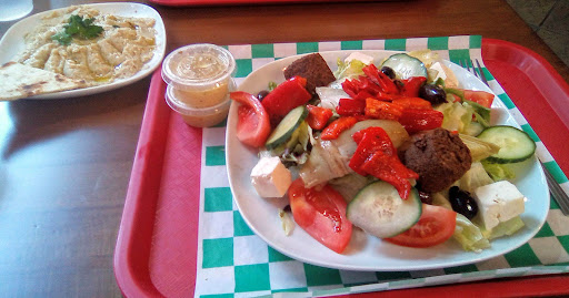 Our second visit, I ordered the enormously portioned Mediterranean salad with falafel, baba ganoush & pita; a friend had the same salad (we could have split one and had leftovers) with falafel. There is a "build your own salad" option, which I might try to get a smaller Mediterranean salad.