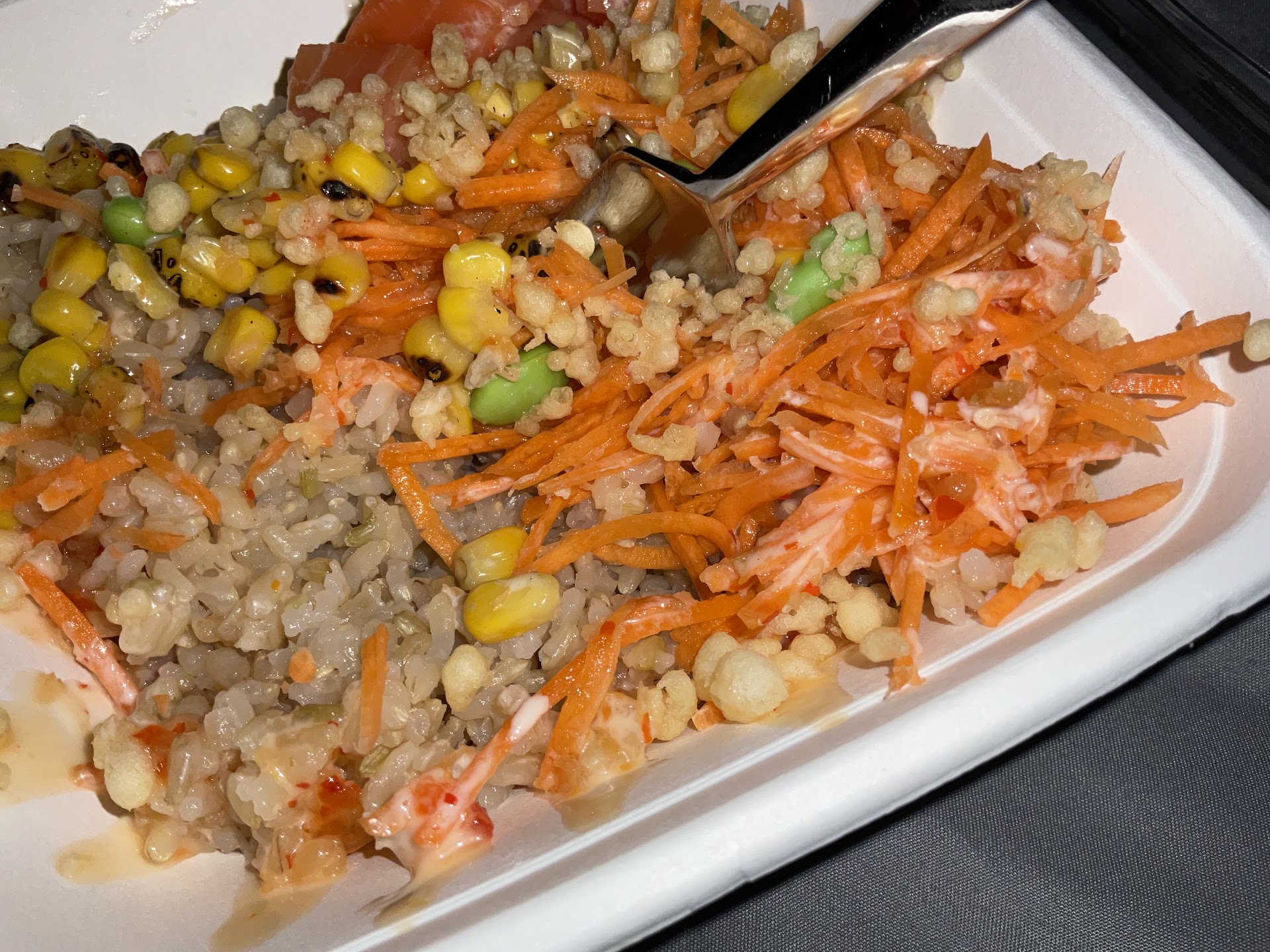 Read moreThis place definitely isn’t bad, and I feel the rating is a tad low. Now, I haven’t tried their sushi, but they’re poke bowls — those are quite good, I believe. I tried their Build Your Own Poke bowl, which I created with brown rice, smoked salmon, tempura flakes, soy sauce, carrots, corn, edamame, and sweet chili sauce.